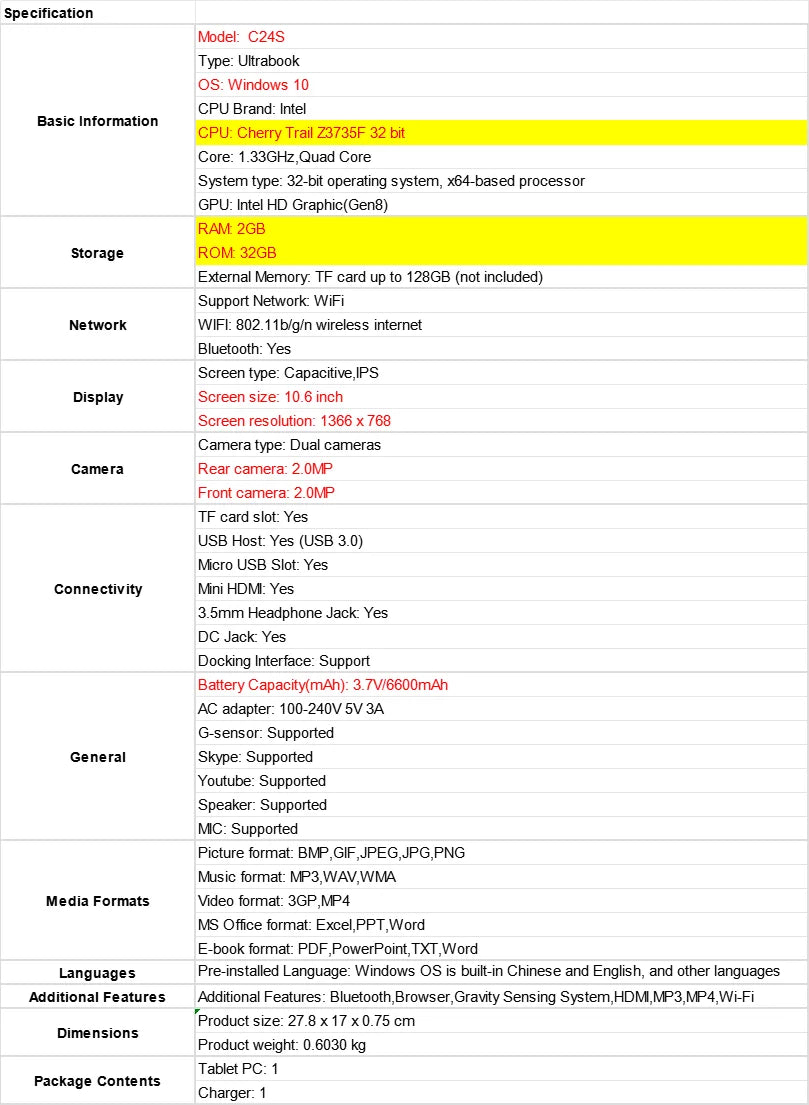 10.6 inch 2GB 32GB: 32 Bit 1366*768