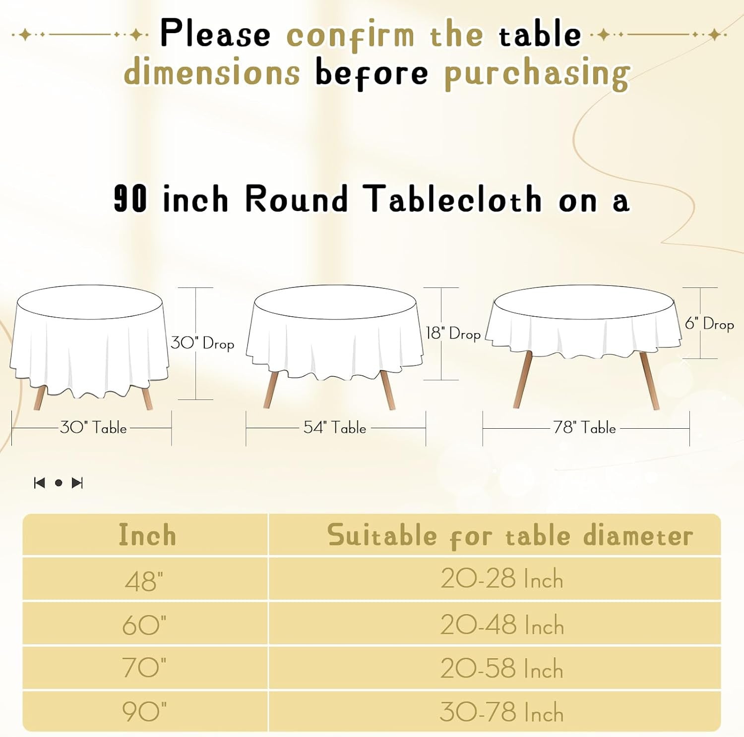 Unit Count 10.0 Count Style Modern Weave Type Satin Weave Number of Items 10 Color Gold Pattern Solid Material Satin Shape Round Number of Sets 10 Item Weight 7.26 pounds Theme Elegant Occasion Universal Size 90 inches Special Feature Wrinkle Resistant Product Dimensions 90"L x 90"W Product Care Instructions Machine Wash