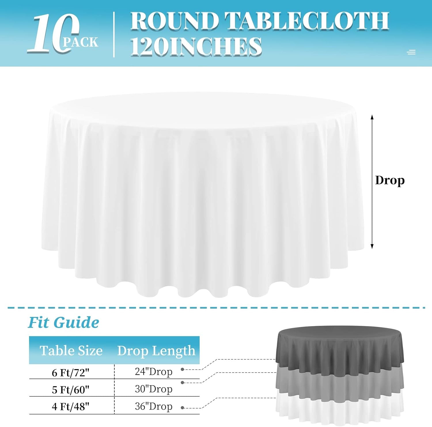 Item model number TB13X Style Durable Material Polyester Weave Type Satin Weave Number of Items 10 Pattern Solid Number of Sets 1 Theme Special Occasions Unit Count 1.0 Count Product Dimensions 120"L x 120"W Seating Capacity 6 Corner Style Rounded Seasons All-Season Finish Type Matte Hem stitch type Running Item Weight 18.96 pounds Occasion Baby Shower, Holiday, Wedding Special Feature Wrinkle Resistant Color White Global Trade Identification Number 08155202558186 Shape Round Recommended Uses For Product Dining Table Fabric Type Linen,polyester Product Care Instructions Machine Wash Size 120 In