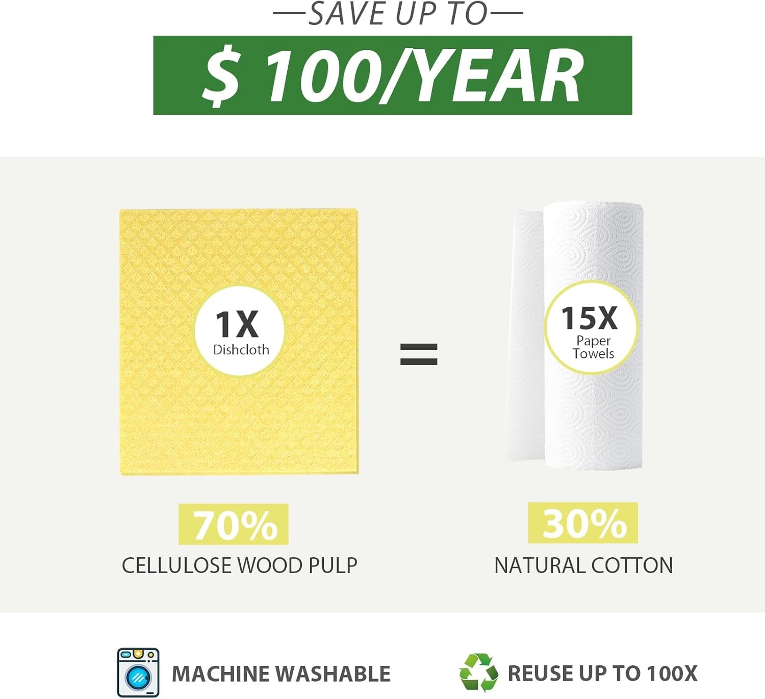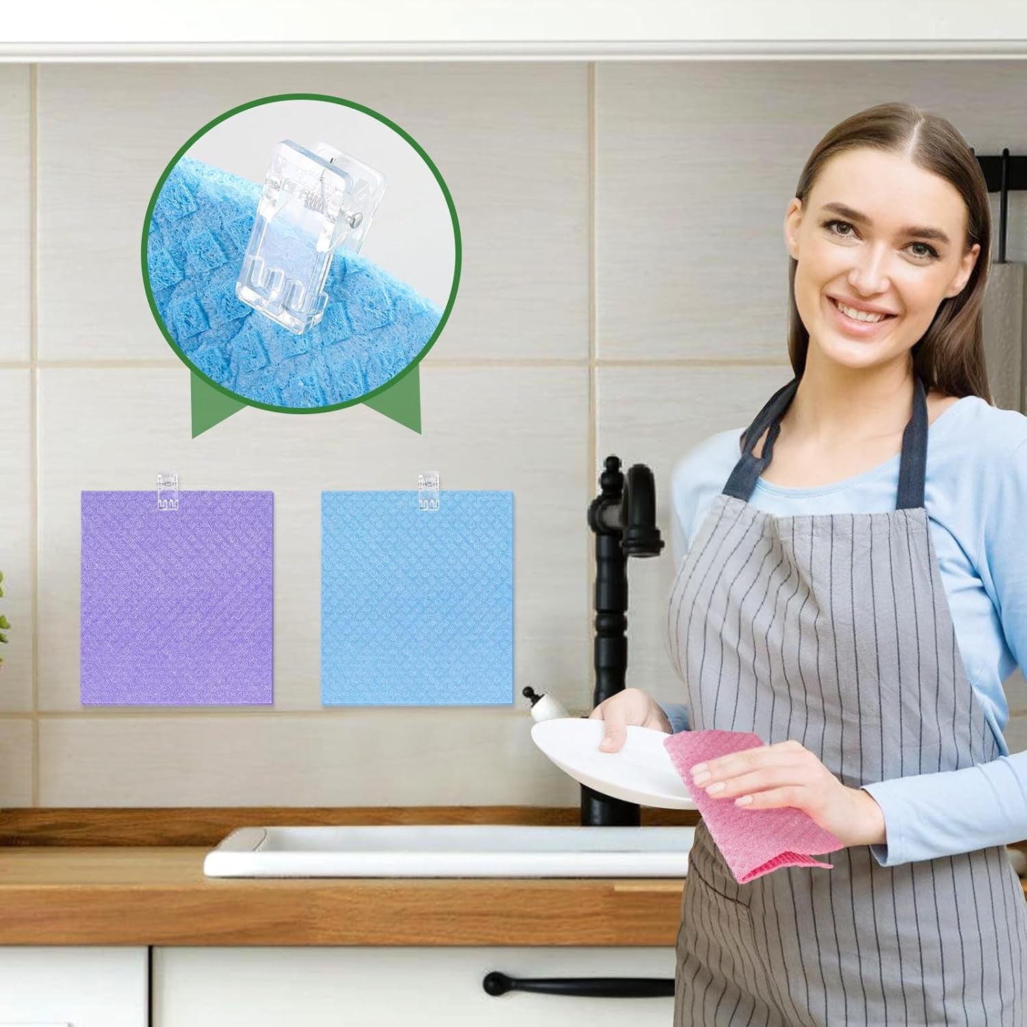 10 Pack Swedish Dishcloths, Reusable Cellulose Sponge Cloths with Adhesive Clips