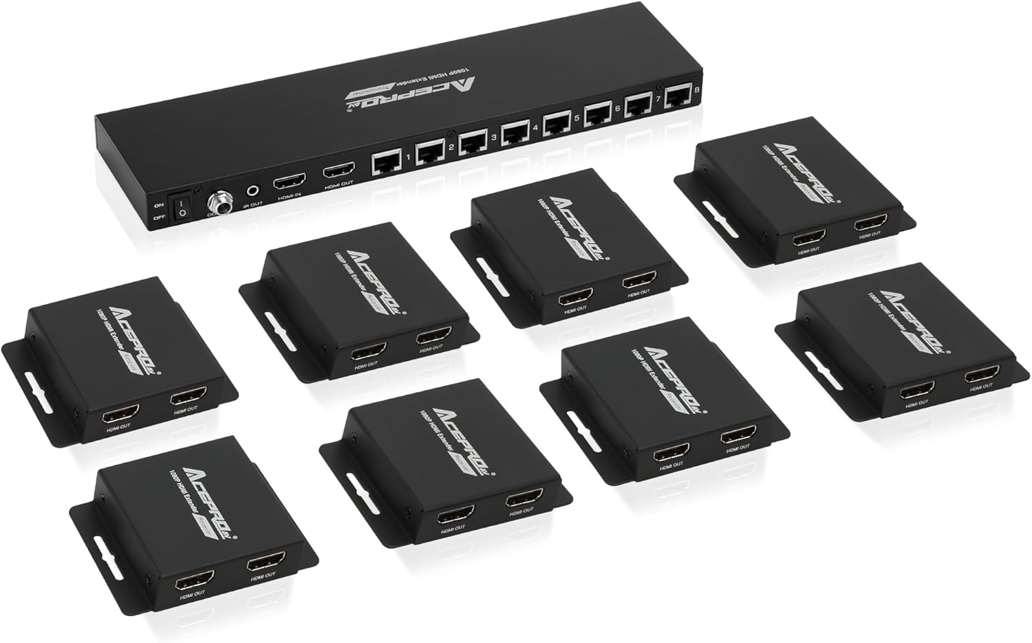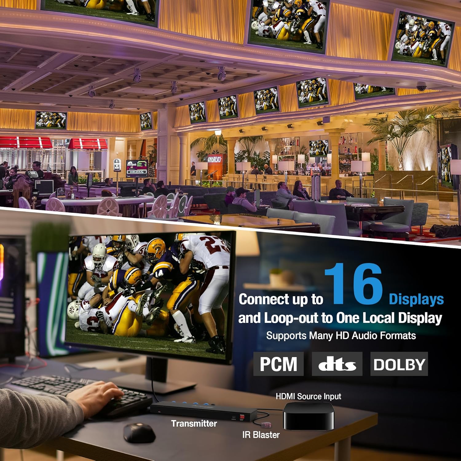 - 1 In 16 Out Full HD HDMI Extender: Connect up to 16 Full HD 1920x1080 displays from one HDMI source using CAT6/6a/7/8 cables. Includes 1 Transmitter and 8 Receivers; each Receiver supports 2 displays (not an HDMI switch).