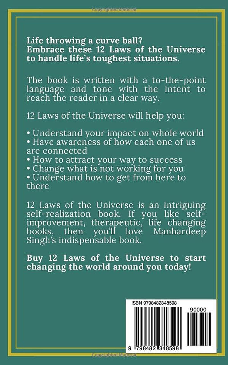 The book is written with a to-the-point language and tone with the intent to reach the reader in a clear way. 12 Laws of the Universe will help you: • Understand your impact on whole world • Have awareness of how each one of us are connected • How to attract your way to success • Change what is not working for you • Understand how to get from here to there 12 Laws of the Universe is an intriguing self-realization book. If you like self-improvement, therapeutic, life changing books, then you’ll love Manhardeep Singh’s indispensable book. Buy 12 Laws of the Universe to start changing the world around you today!Life throwing a curve ball? Embrace these 12 Laws of the Universe to handle life’s toughest situations.