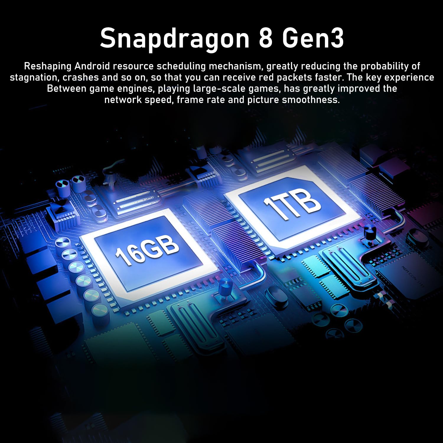 - 【Snapdragon8 Gen3】 Snapdragon8 Gen3 12 Core CPU with 16GB+1024GB of memory is enough for you to use any application simultaneously, including watching movies and playing games. Install an additional storage card to easily store your favorite music, videos, and pictures.
