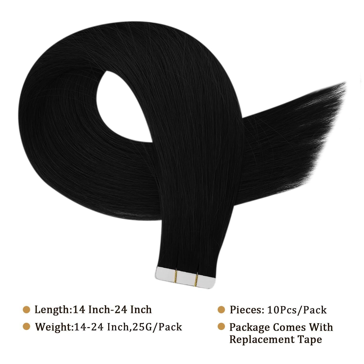 18Inch Black Virgin Tape in Hair Extensions Remy Tape in Human Hair Extensions Color 1 Black 25 Gram Seamless Unprocessed Skin Weft 10Pcs for Women