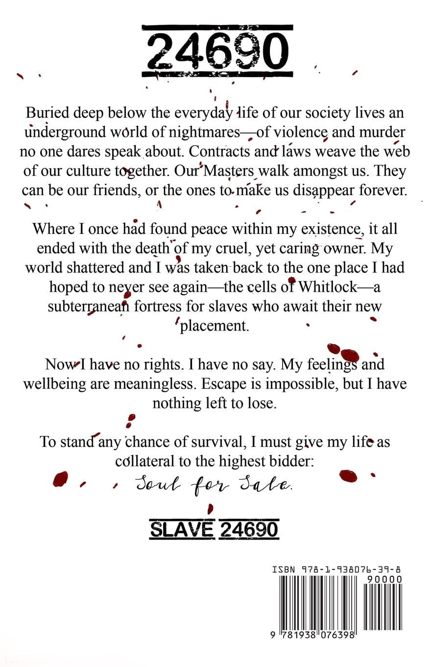 Buried deep below the everyday life of our society lives an underground world of nightmares-of violence and murder no one dares speak about. Contracts and laws weave the web of our culture together. Our Masters walk amongst us. They can be our friends, or the ones to make us disappear forever. Where I once had found peace within my existence, it all ended with the death of my cruel, yet caring owner. My world shattered and I was taken back to the one place I had hoped to never see again-the cells of Whitlock-a subterranean fortress for slaves who await their new placement. Now I have no rights. I have no say. My feelings and wellbeing are meaningless. Escape is impossible, but I have nothing left to lose. To stand any chance of survival, I must give my life as collateral to the highest bidder: Soul for Sale. slave 24690