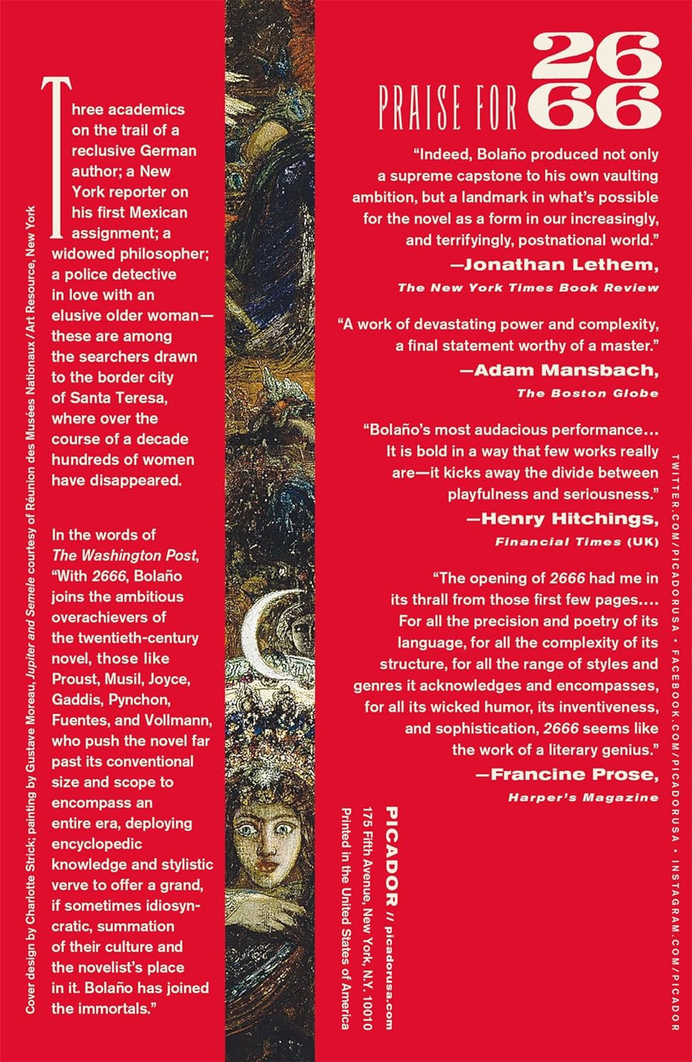 Composed in the last years of Roberto Bolaño's life, 2666 was greeted across Europe and Latin America as his highest achievement, surpassing even his previous work in its strangeness, beauty, and scope. Its throng of unforgettable characters includes academics and convicts, an American sportswriter, an elusive German novelist, and a teenage student and her widowed, mentally unstable father. Their lives intersect in the urban sprawl of SantaTeresa―a fictional Juárez―on the U.S.-Mexico border, where hundreds of young factory workers, in the novel as in life, have disappeared.