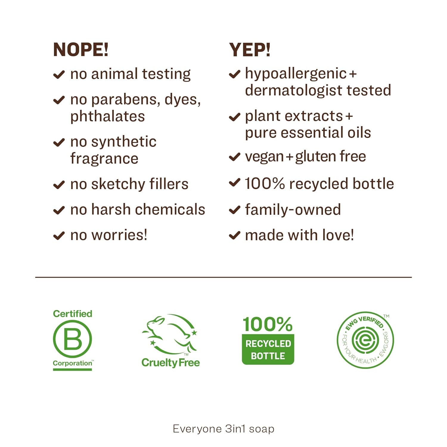 Simplify your routine with our ultimate multitasking 3in1 Soap. As a body wash,bubble bath, and shampoo, this nourishing soap is hypoallergenic* and dermatologist-tested. Feel good knowing our formula doesn’t contain dyes, parabens, phthalates, or synthetic fragrances, so you can focus on just getting clean and feeling great! *Individual skin types may vary