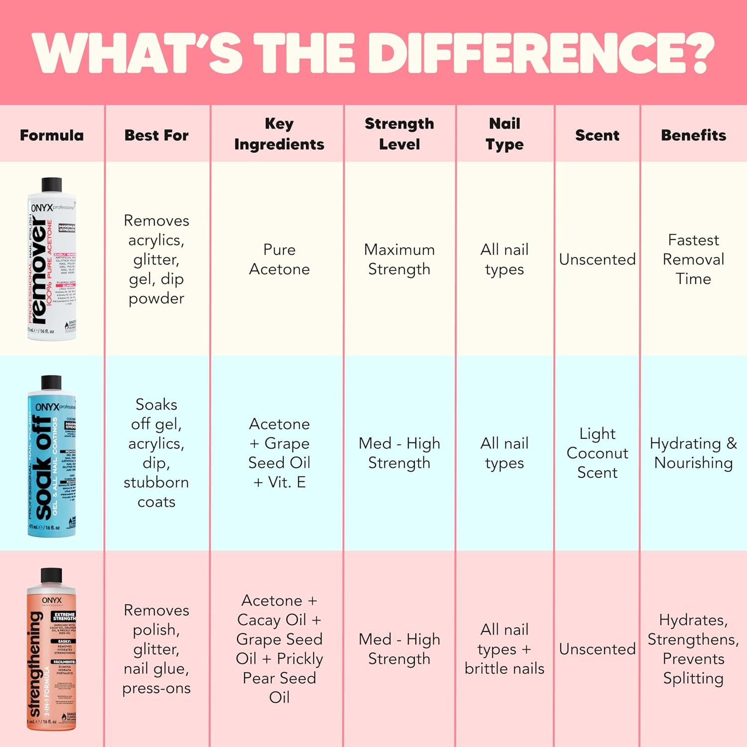 This isn’t just nail polish remover—it’s your first step to a healthier, more resilient nails. Whether you’re switching up your manicure, taking a break from gels and press-ons, or focusing on nail health, ONYX Professional Strengthening 3-in-1 Nail Polish Remover delivers pro-level results—at home. This salon-quality nail polish remover easily removes nail polish, glitter polish, nail glue, and press-ons, while helping strengthen nails with every use. The non-drying formula is infused with Grapeseed Oil, Cacay Oil, and Cactus Seed Oil to hydrate and support stronger, healthier-looking nails—helping prevent the chips, splits, peeling, and cracks that can come from frequent manicures. ONYX Professional Strengthening 3-in-1 Nail Polish Remover is part of a powerful strengthening regimen when paired with Hard as Hoof Nail Strengthening Cream to restore, fortify, and protect your nails – and your manicure.