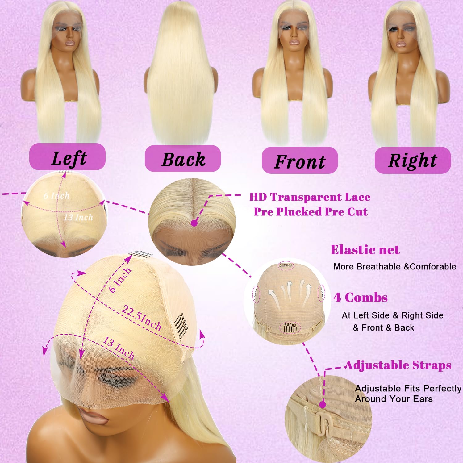 - HD Lace Front Wigs Human Hair Cap Size: glueless wigs adjustable comfort design for all head sizes,the 22.5 inch average cap includes 4 secure combs and dual elastic straps for a snug, glueless fit. More comfortable to wear, friendly for beginners