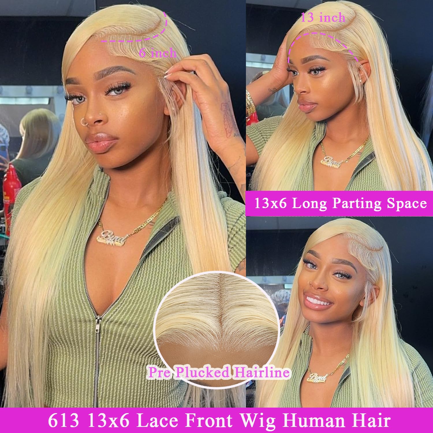 - 613 13x6 Lace Front Wigs Human Hair:13x6 HD transparent swiss lace matches all skin perfectly. 13x6 larger lace area and more parting space breathable ,durable and soft. This 613 human hair wig allows middle/side /C parts, and free styling