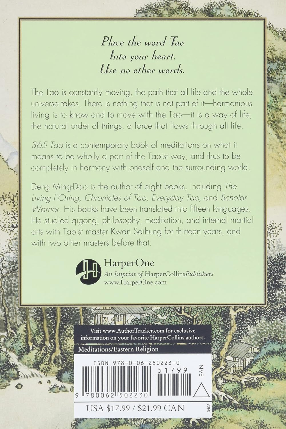 Place the word Tao The Tao is constantly moving, the path that all life and the whole universe takes. There is nothing that is not part of it—harmonious living is to know and to move with the Tao—it is a way of life, the natural order of things, a force that flows through all life. 365 Tao is a contemporary book of meditations on what it means to be wholly a part of the Taoist way, and thus to be completely in harmony with oneself and the surrounding world. Deng Ming-Dao is the author of eight books, including The Living I Ching, Chronicles of Tao, Everyday Tao, and Scholar Warrior. His books have been translated into fifteen languages. He studied qigong, philosophy, meditation, and internal martial arts with Taoist master Kwan Saihung for thirteen years, and with two other masters before that.