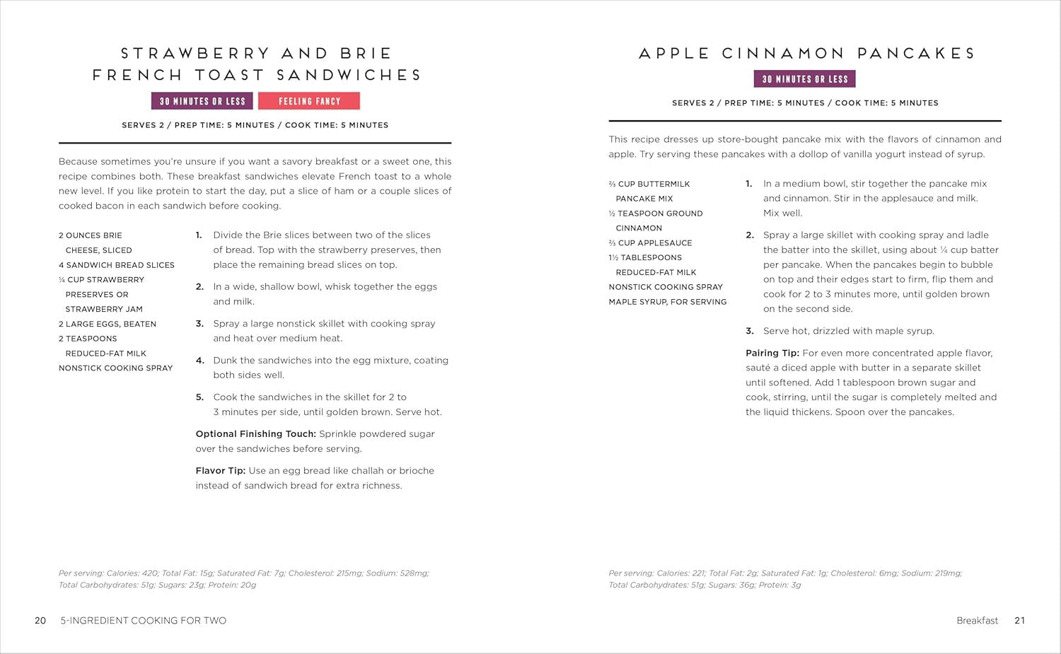 Simple and flavorful 5-ingredient meals―tailor-made for your table of two Small-batch cooking is a great way to save time and reduce waste―and with just a few ingredients, you can truly let the natural flavors of your dishes shine. This cookbook simplifies cooking for two, highlighting wholesome, healthy recipes requiring only five everyday ingredients. You'll find 100 delicious two-person meals, from Breakfast Quesadillas to Blueberry Clafoutis, as well as budget-savvy shopping lists, tips on meal planning, and easy cooking techniques to elevate each flavorful dish. Enjoy wholesome meals made for two with: Scale down your recipe yields without sacrificing taste with this delicious couple's cookbook.