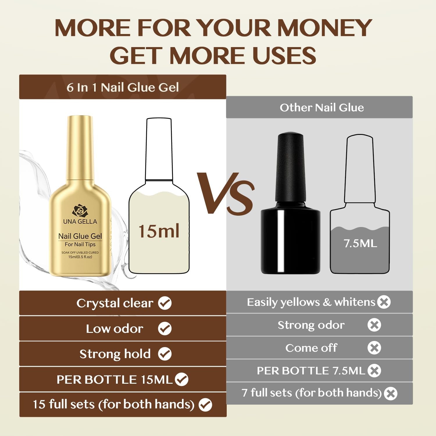 6 in 1 Gel Nail Glue for Clear Acrylic Nails Tips, 15Ml UV Nail Glue Long Lastin
