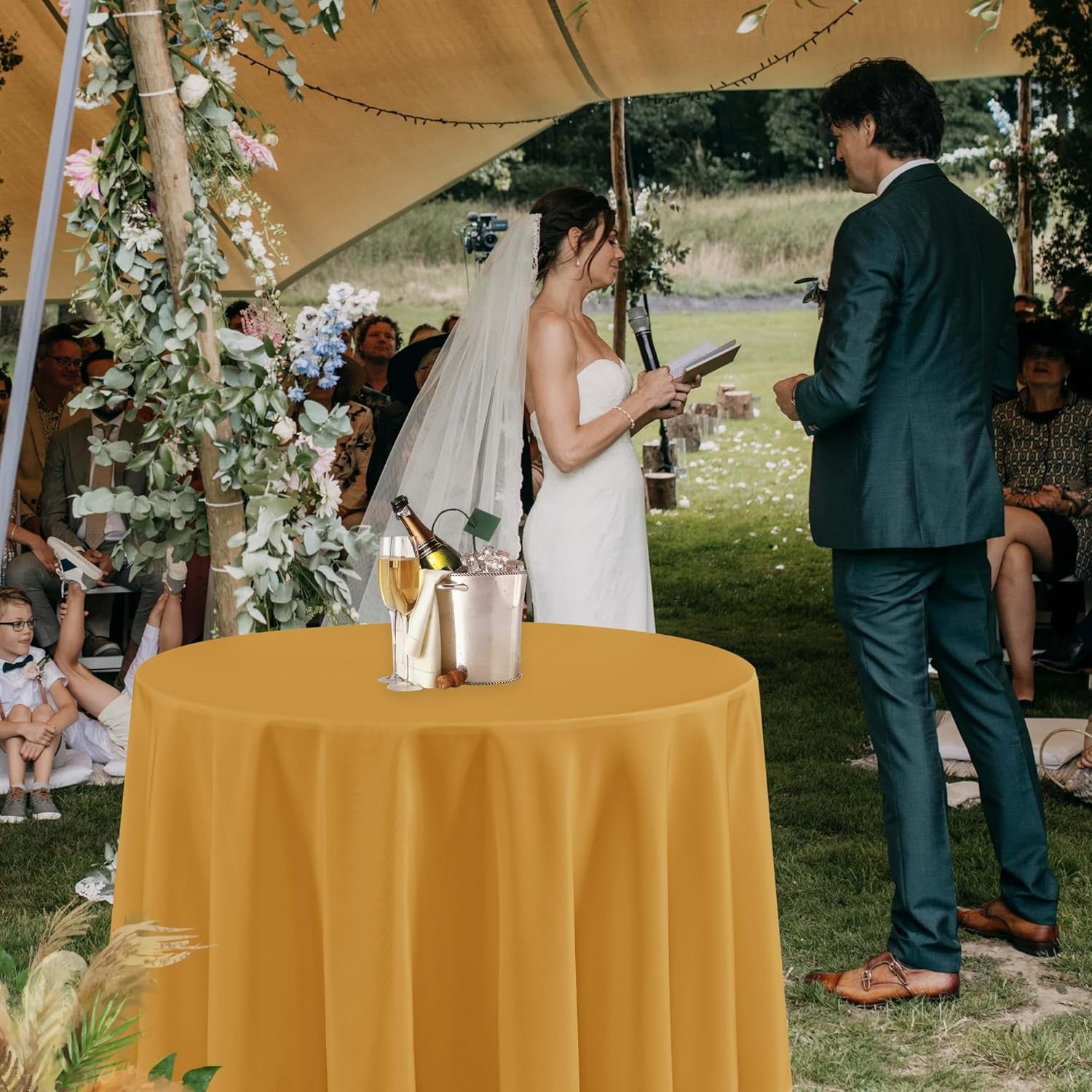 6 Pack Gold round Tablecloths - 120 Inches round - Wrinkle and Stain Resistant Fabric Table Clothes, Washable Polyester Table Covers for Wedding Party Banquet Formal Events Fall Thanksgiving