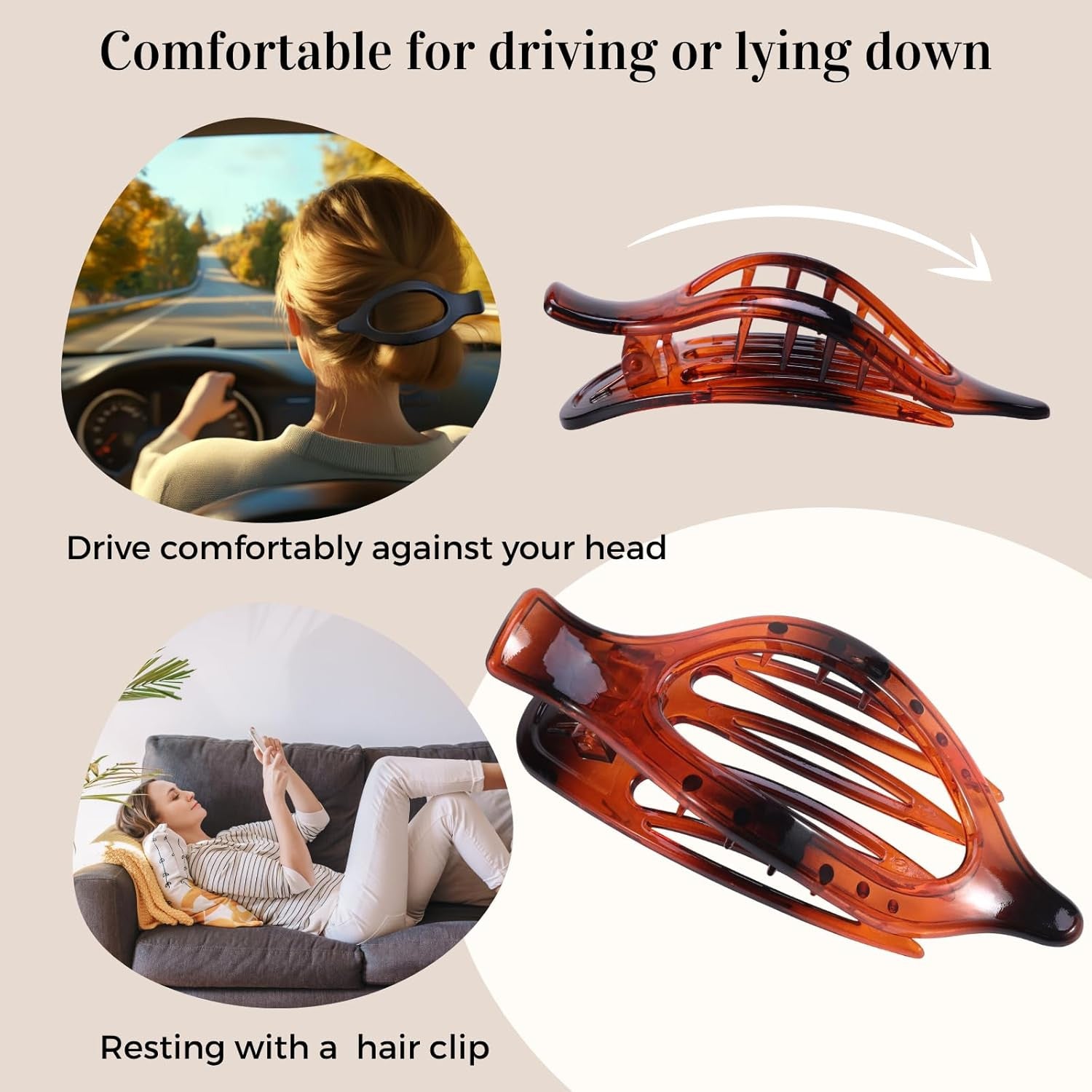 Do these flat hair clips work for thick or curly hair? Yes! Twist your hair tightly and slide the clip through the base. Many users with thick, curly, or long hair say it holds well for all-day wear. Are these clips good for fine or thin hair? Will they stay in place? They work for fine hair if styled into a twist or bun. For extra hold, tease your hair or use texture spray. Half-up styles are also a great option. Can I wear these clips while driving or lying down? Yes! These lay flat against your head, making them perfect for resting, driving, or even sleeping—no more poking from claw clips. Are they easy to use? How do I wear them properly? Twist your hair, slide the inner teeth through the base, and snap the outer piece over. It may take a try or two, but gets easy quickly. Are they sturdy and stylish enough for daily use or gifting? Definitely. They're durable, come in matte neutral colors, and are perfect for everyday wear or sharing with friends and family.