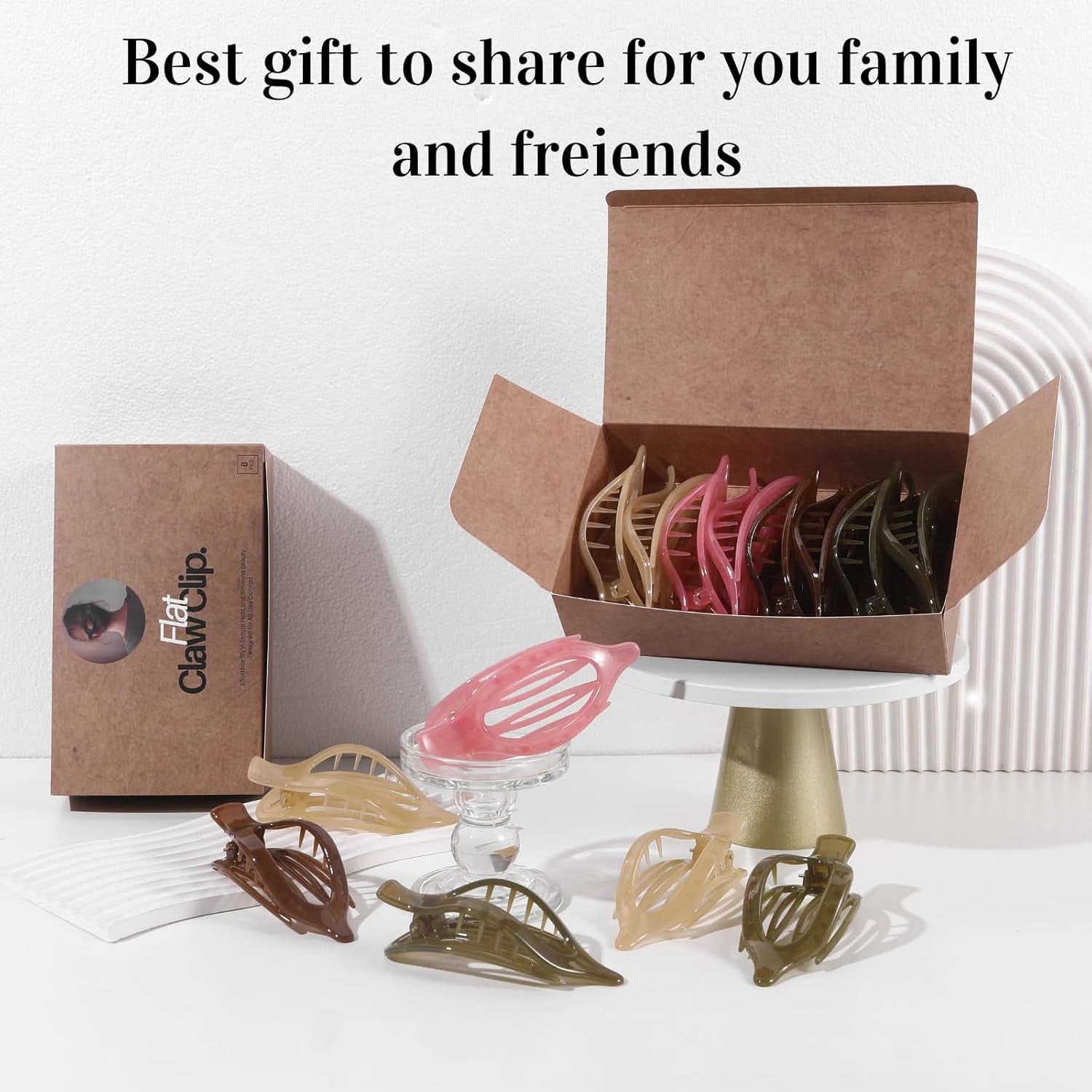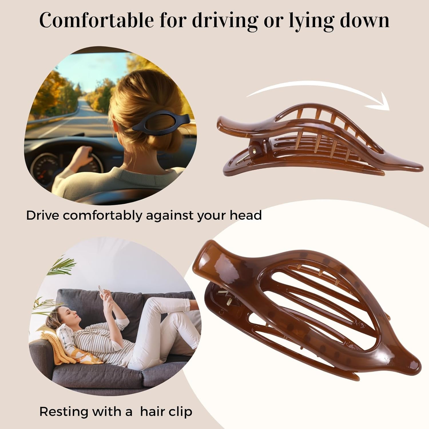 Do these flat hair clips work for thick or curly hair? Yes! Twist your hair tightly and slide the clip through the base. Many users with thick, curly, or long hair say it holds well for all-day wear. Are these clips good for fine or thin hair? Will they stay in place? They work for fine hair if styled into a twist or bun. For extra hold, tease your hair or use texture spray. Half-up styles are also a great option. Can I wear these clips while driving or lying down? Yes! These lay flat against your head, making them perfect for resting, driving, or even sleeping—no more poking from claw clips. Are they easy to use? How do I wear them properly? Twist your hair, slide the inner teeth through the base, and snap the outer piece over. It may take a try or two, but gets easy quickly. Are they sturdy and stylish enough for daily use or gifting? Definitely. They're durable, come in matte neutral colors, and are perfect for everyday wear or sharing with friends and family.
