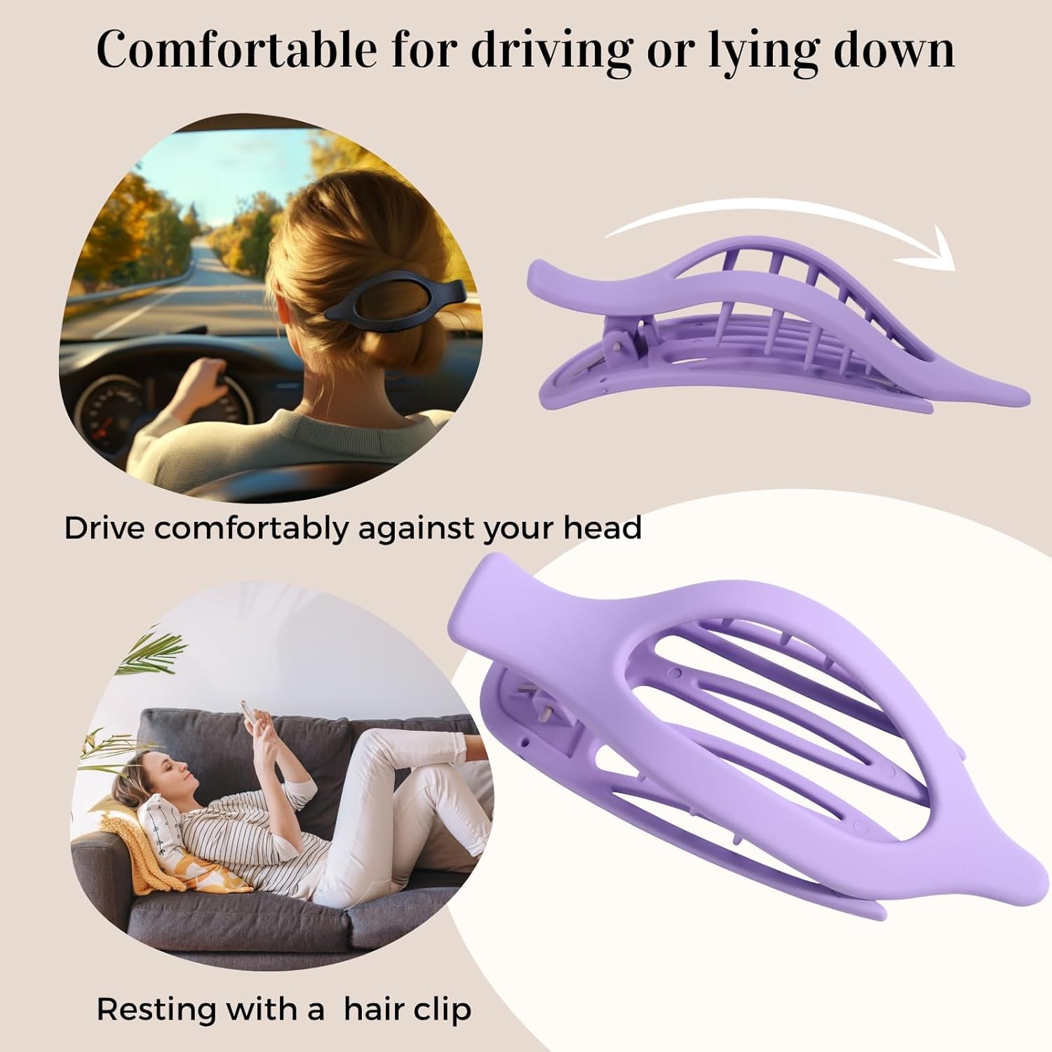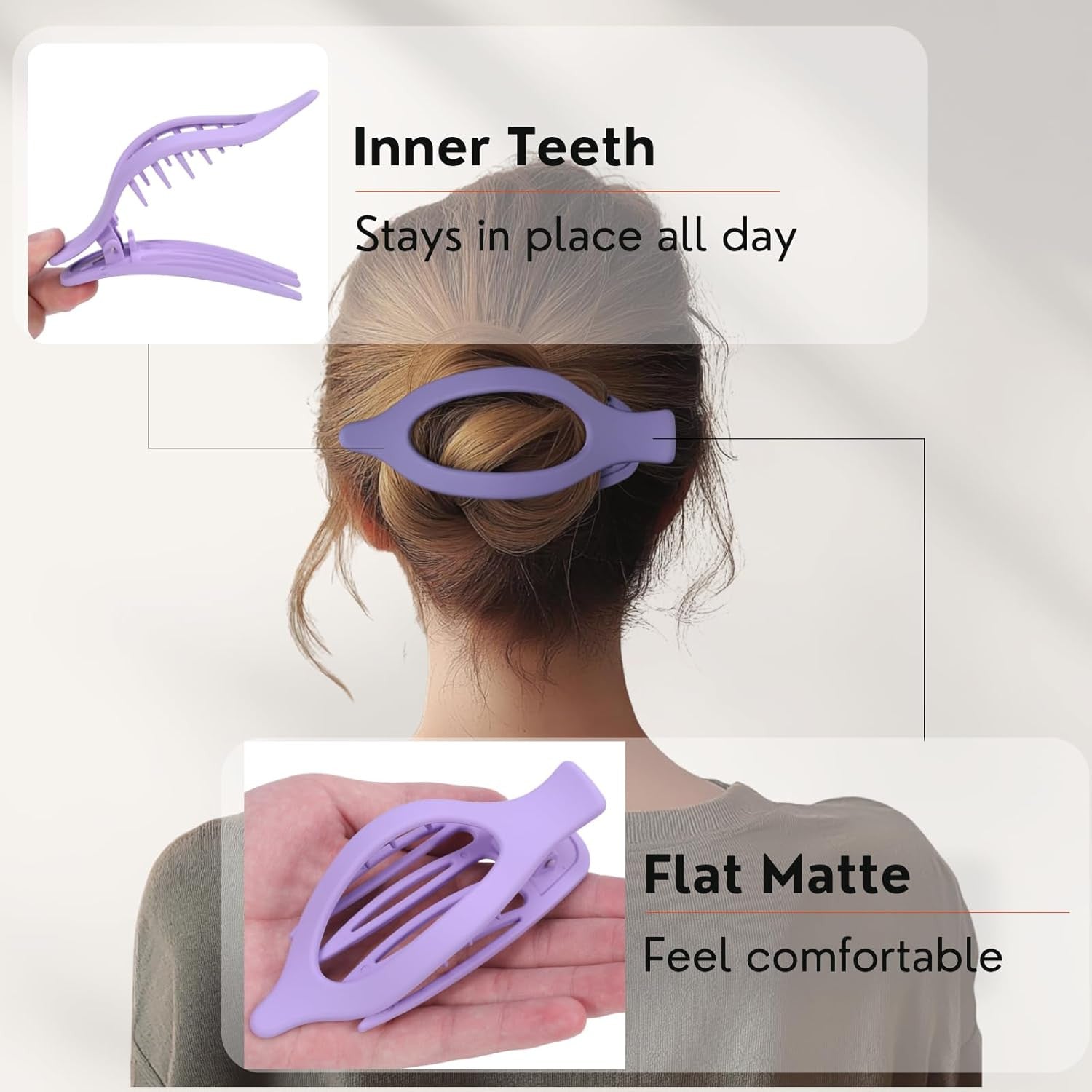 Do these flat hair clips work for thick or curly hair? Yes! Twist your hair tightly and slide the clip through the base. Many users with thick, curly, or long hair say it holds well for all-day wear. Are these clips good for fine or thin hair? Will they stay in place? They work for fine hair if styled into a twist or bun. For extra hold, tease your hair or use texture spray. Half-up styles are also a great option. Can I wear these clips while driving or lying down? Yes! These lay flat against your head, making them perfect for resting, driving, or even sleeping—no more poking from claw clips. Are they easy to use? How do I wear them properly? Twist your hair, slide the inner teeth through the base, and snap the outer piece over. It may take a try or two, but gets easy quickly. Are they sturdy and stylish enough for daily use or gifting? Definitely. They're durable, come in matte neutral colors, and are perfect for everyday wear or sharing with friends and family.