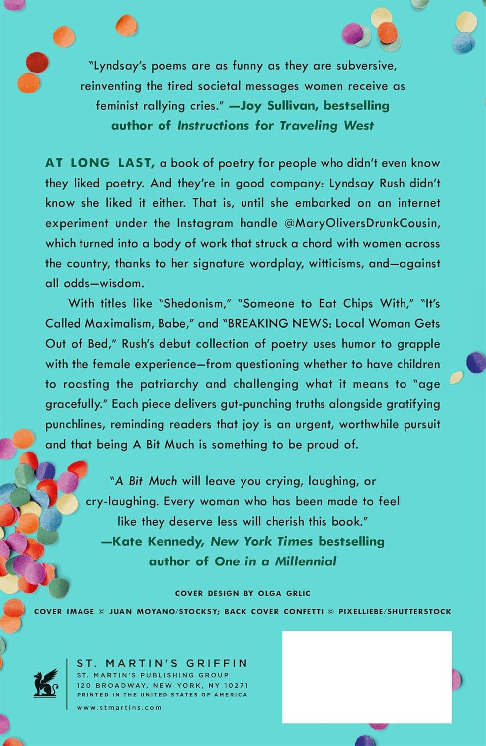 With titles like "Shedonism", "Someone to Eat Chips With", "It’s Called Maximalism, Babe", and "Breaking News: Local Woman Gets Out of Bed", Rush’s debut collection of poetry uses humor to grapple with the female experience―from questioning whether or not to have children, to roasting the patriarchy, to challenging what it means to "age gracefully"―and each piece delivers gut-punching truths alongside gratifying punchlines. Readers walk away from Lyndsay’s work feeling seen, celebrated, and wholly convinced that joy is an urgent, worthwhile pursuit.