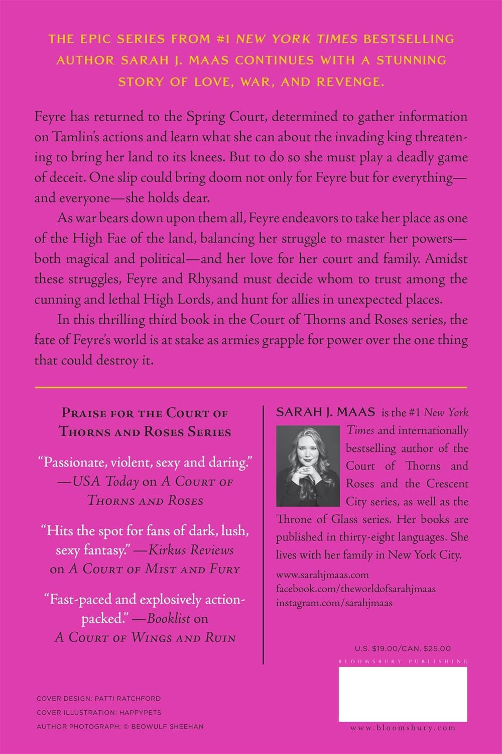 As war bears down upon them all, Feyre endeavors to take her place amongst the High Fae of the land, balancing her struggle to master her powers-both magical and political-and her love for her court and family. Amidst these struggles, Feyre and Rhysand must decide whom to trust amongst the cunning and lethal High Lords, and hunt for allies in unexpected places.