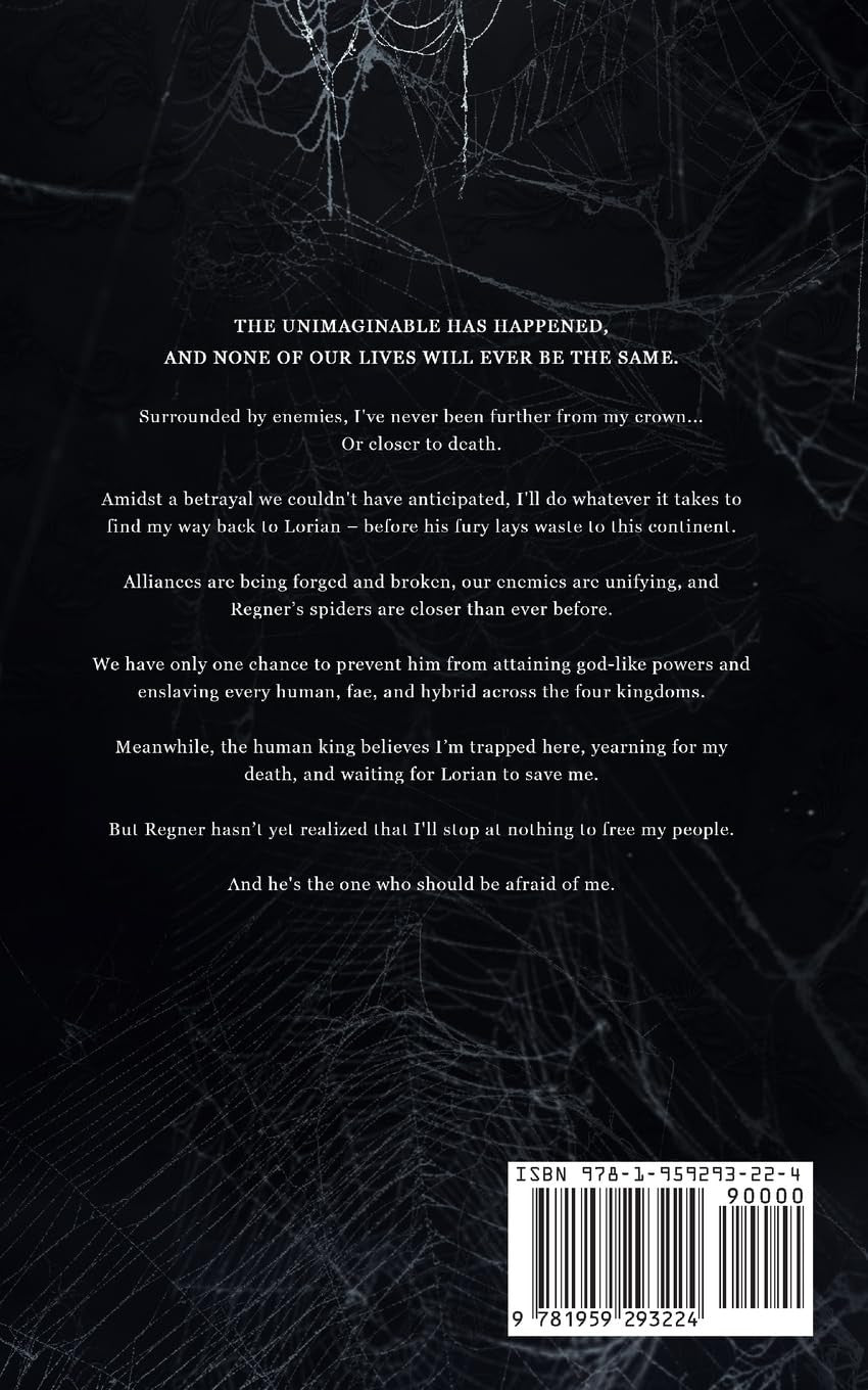 Surrounded by enemies, I've never been further from my crown... Or closer to death. Amidst a betrayal we couldn't have anticipated, I'll do whatever it takes to find my way back to Lorian - before his fury lays waste to this continent. Alliances are being forged and broken, our enemies are unifying, and Regner's spiders are closer than ever before. We have only one chance to prevent him from attaining god-like powers and enslaving every human, fae, and hybrid across the four kingdoms. Meanwhile, the human king believes I'm trapped here, yearning for my death, and waiting for Lorian to save me. But Regner hasn't yet realized that I'll stop at nothing to free my people. And he's the one who should be afraid of me.