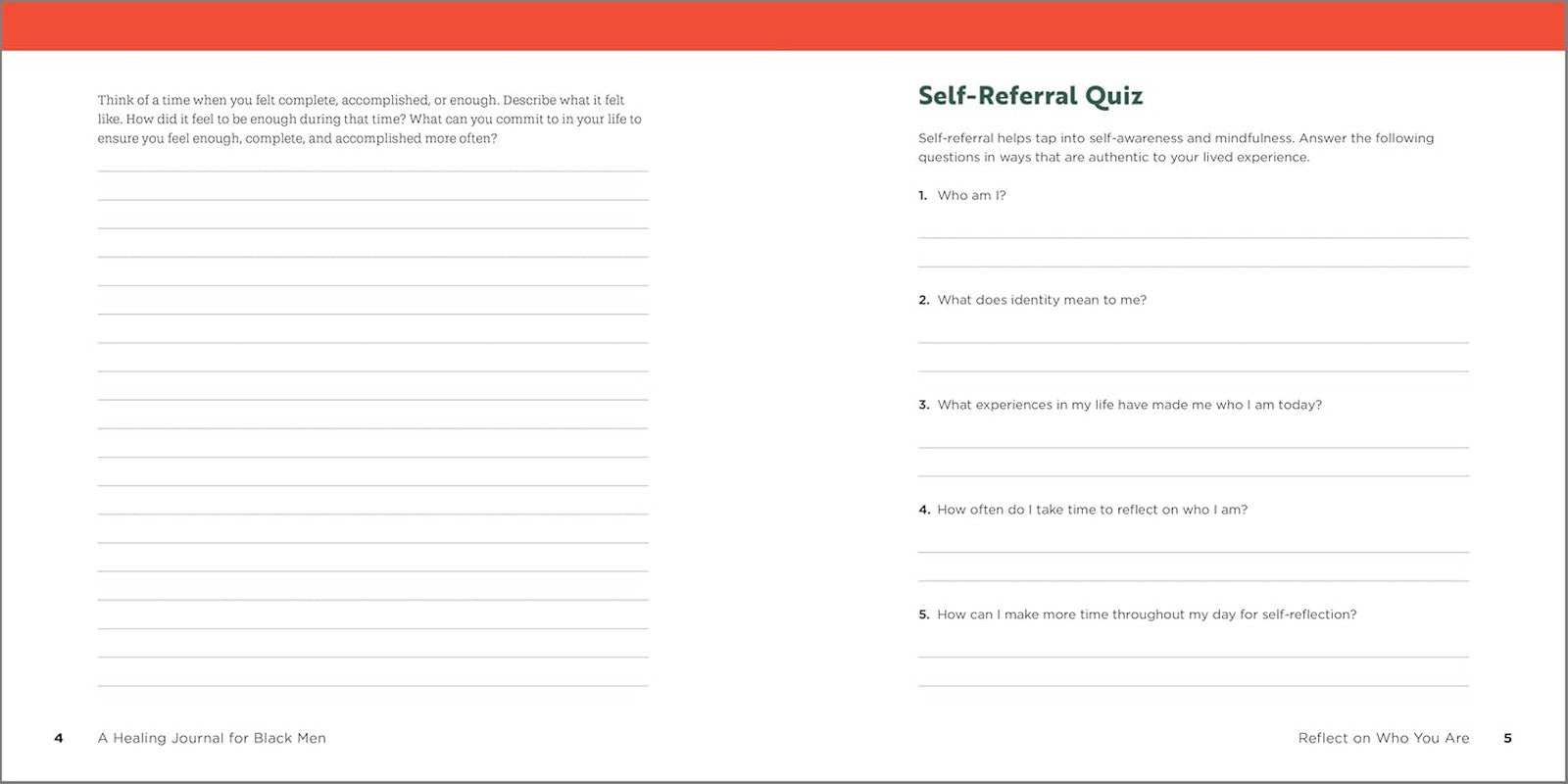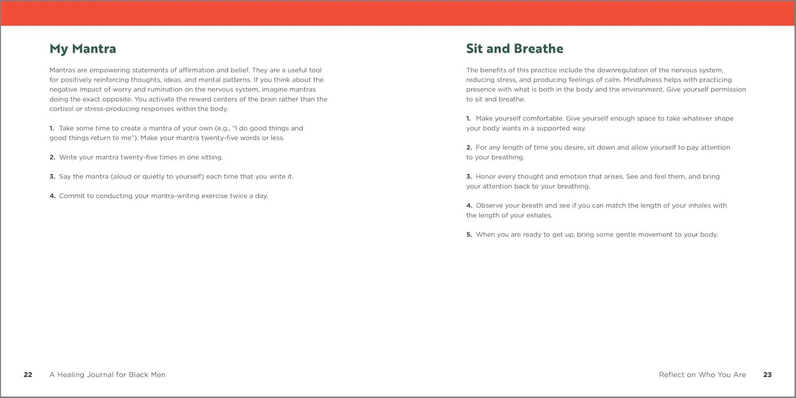 Create space for reflection and self-care with healing prompts for Black men Journaling is a powerful tool for healing that has been used by many great Black men. This guided journal is filled with prompts and practices that encourage you to reflect, heal, and live authentically in your Black manhood. You'll learn to root yourself in self-care and cultivate greater peace in your life so you can truly thrive. Celebrate your Blackness and uncover a sense of wholeness with this healing journal for men.