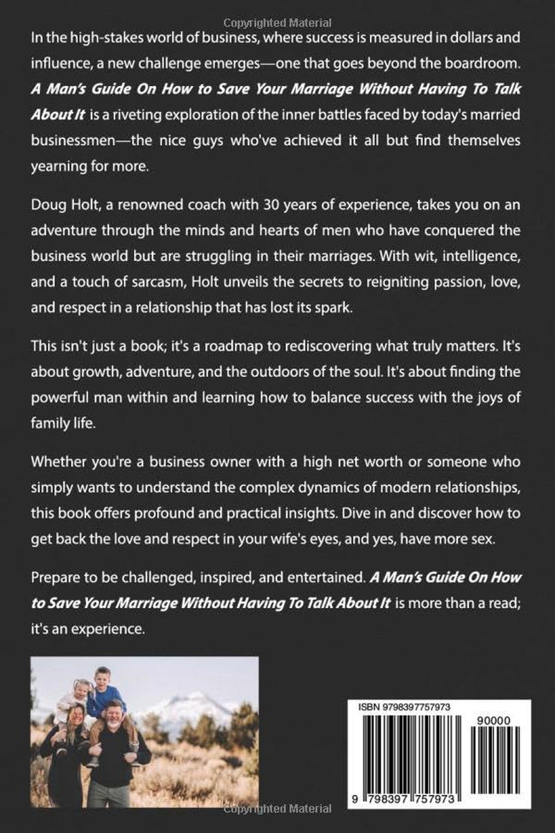 In the high-stakes world of business, where success is measured in dollars and influence, a new challenge emerges - one that goes beyond the boardroom. A man's Guide On How to Save Your Marriage Without Having To Talk About It is a riveting exploration of the inner battles faced by today's married businessmen - the nice guys who've achieved it all but find themselves yearning for more. Doug Holt, a renowned coach with 30 years of experience, takes you on an adventure through the minds and hearts of men who have conquered the business world but are struggling in their marriages. With wit, intelligence, and a touch of sarcasm, Holt unveils the secrets to reigniting passion, love and respect in a relationship that has lost its spark. This isn't just a book; it's a roadmap to rediscovering what truly matters. It's about growth, adventure, and the outdoors of the soul. It's about finding the powerful man within and learning how to balance success with the joys of family life. Table Of Contents: