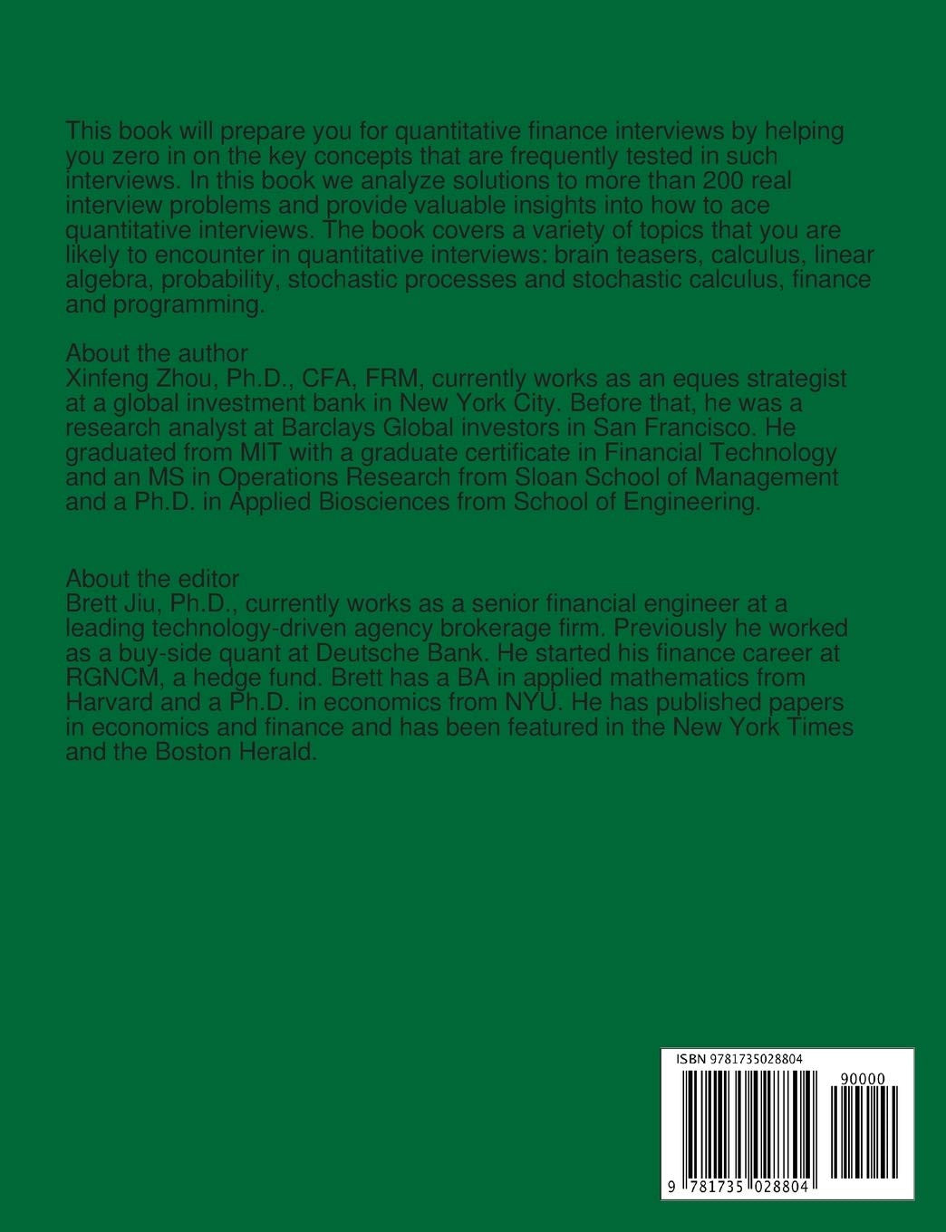 This book will prepare you for quantitative finance interviews by helping you zero in on the key concepts that are frequently tested in such interviews. In this book we analyze solutions to more than 200 real interview problems and provide valuable insights into how to ace quantitative interviews. The book covers a variety of topics that you are likely to encounter in quantitative interviews: brain teasers, calculus, linear algebra, probability, stochastic processes and stochastic calculus, finance and programming.