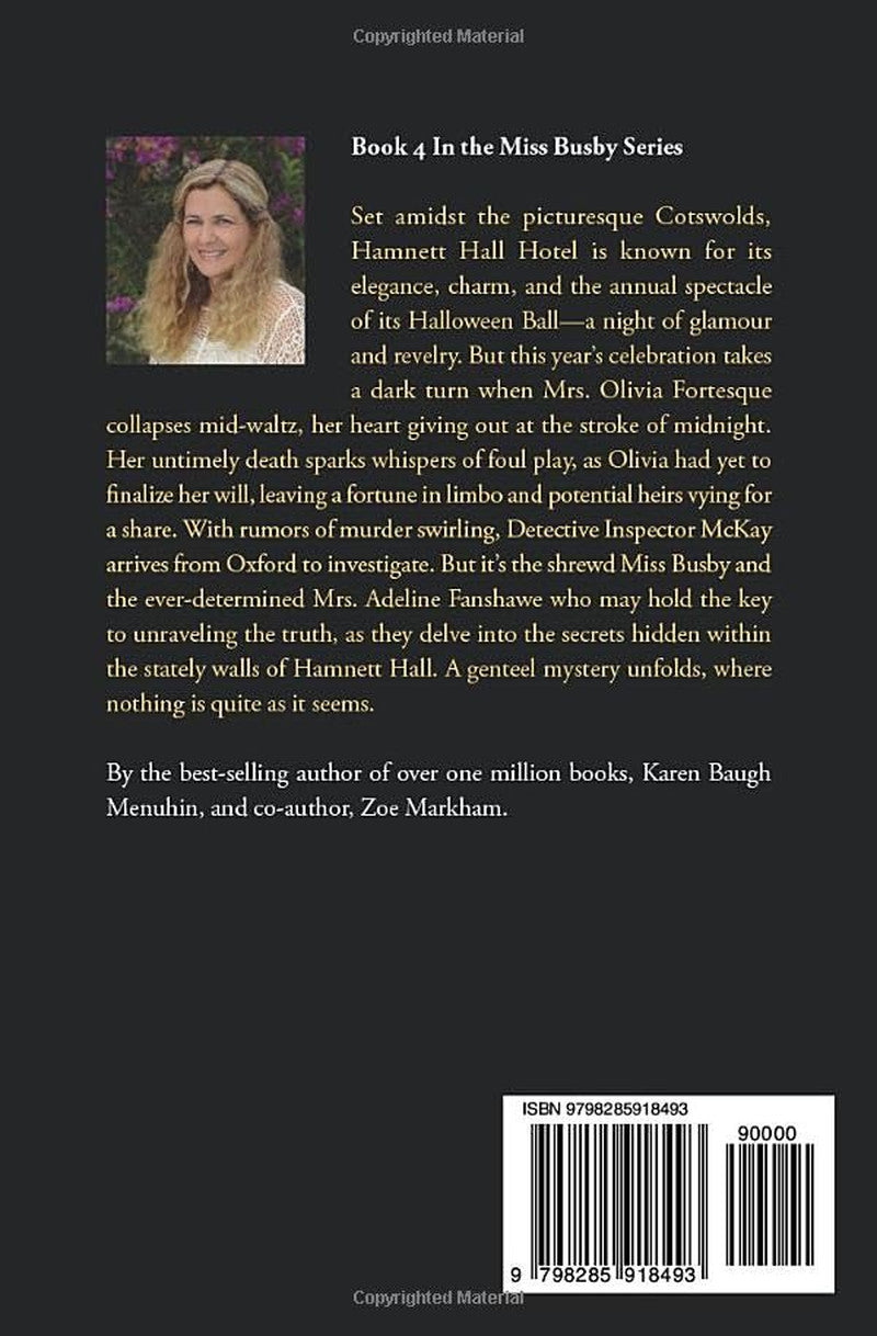 Set amidst the picturesque Cotswolds, Hamnett Hall Hotel is known for its elegance, charm, and the annual spectacle of its Halloween Ball—a night of glamour and revelry. But this year's celebration takes a dark turn when Mrs. Olivia Fortesque collapses mid-waltz, her heart giving out at the stroke of midnight. Her untimely death sparks whispers of foul play, as Olivia had yet to finalize her will, leaving a fortune in limbo and potential heirs vying for a share. With rumors of murder swirling, Detective Inspector McKay arrives from Oxford to investigate. But it's the shrewd Miss Busby and the ever-determined Mrs. Adeline Fanshawe who may hold the key to unraveling the truth, as they delve into the secrets hidden within the stately walls of Hamnett Hall. A genteel mystery unfolds, where nothing is quite as it seems.