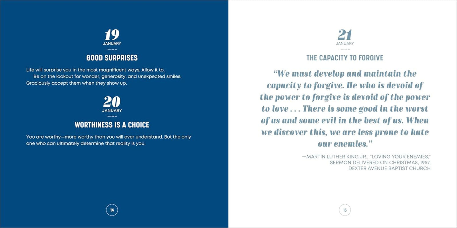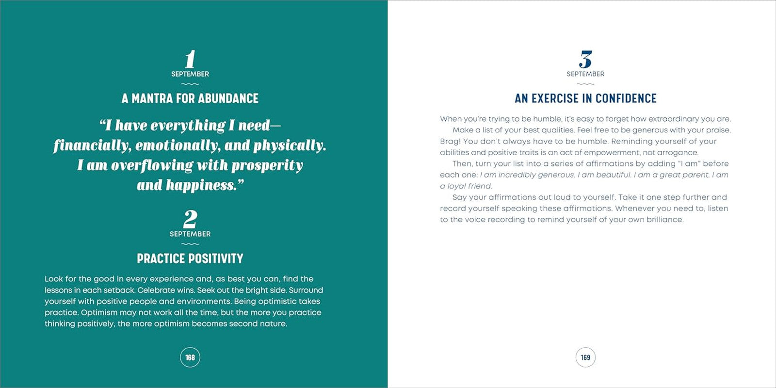 Embrace positivity every day for a happier outlook on life! Are you looking to feel energized and motivated? Start here! Over the course of one year, this inspirational book can transform your mindset and inspire the habit of positive thinking with daily doses of digestible quotes, mantras, and prompts. From day one, Cyndie Spiegel―author of Microjoys and sought-after inspirational speaker―teaches you the power of positive thinking through quick and digestible affirmations based in positive psychology, neuroscience, and personal development. Start living with positivity and purpose through this collection of thought-provoking quotes and affirmations.