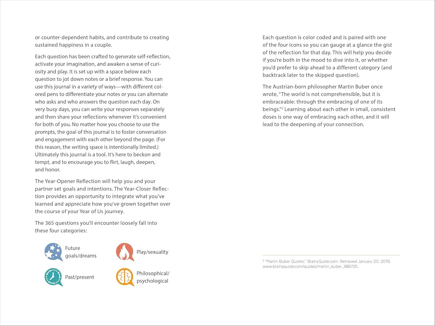 Grow closer with a year's worth of questions for couples  It only takes a few minutes a day to deepen your bond with your partner with this modern couple's journal. Covering everything from the lighthearted to the heartfelt, this book will strengthen your connection as you explore engaging prompts over the course of a year. Kick-start a year of conversation and connection with this couples book to fill out together!