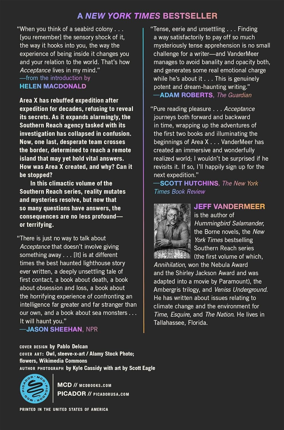 Meanwhile, Acceptance tunnels ever deeper into the circumstances surrounding the creation of Area X―what initiated this unnatural upheaval? Among the many who have tried, who has gotten close to understanding Area X―and who may have been corrupted by it? In this last installment of Jeff VanderMeer’s Southern Reach Trilogy, the mysteries of Area X may be solved, but their consequences and implications are no less profound―or terrifying.