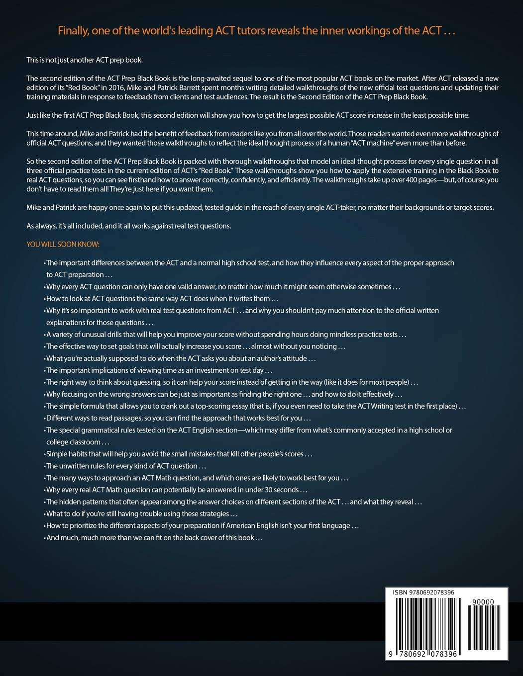 Click the "look inside" feature above to browse the Black Book and get a feel for how it approaches the ACT! The fully up-to-date ACT Prep Black Book, Second Edition gives you unique, effective ACT strategies from Mike Barrett, an ACT tutor with clients all over the globe who pay him hundreds of dollars an hour for phone tutoring. In addition to extensive and effective training on every aspect of the ACT, the ACT Prep Black Book gives you detailed, systematic, easy-to-follow walkthroughs for every question in all 3 official practice tests from the current Official ACT Prep Guide.The Black Book is a must-have in your ACT preparation, whether you need to The Black Book works best when used with the authentic ACT questions in the "Red Book," which is the Official ACT Prep Guide, 2018, by ACT, Inc. The Black Book shows you how to beat the ACT, while the Red Book gives you real ACT questions to practice with. (The ACT Prep Black Book has no affiliation with ACT, Inc.)The Black Book and the Red Book are all you need to get your best possible ACT score.The Black Book is the ideal ACT book for 3 major reasons: Illustrations note: Illustrations, black and white
