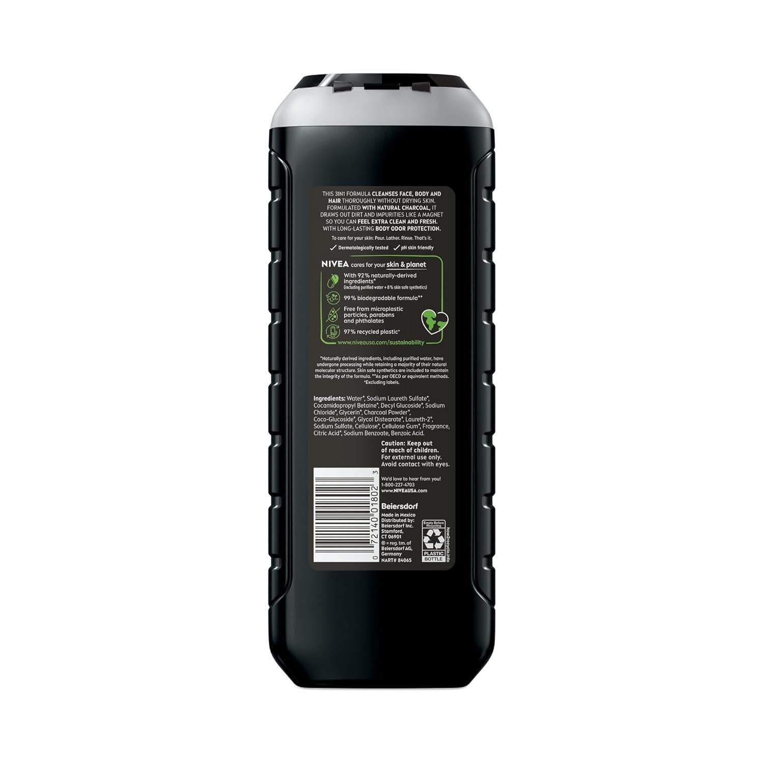 Treat your skin to a deep clean with NIVEA MEN Active Clean Charcoal Body Wash. This mens body wash is specially formulated to actively cleanse skin without drying it out. Formulated for normal to oily skin, NIVEA MEN Active Clean Body Wash is enriched with Natural Charcoal and draws out dirt and impurities like a magnet. The 3-in-1 formula can be used as a face wash, shampoo and body wash. With the unique scent of vanilla and bourbon, this shower gel helps prevent body odor and lasts long after the shower. It is also free of microplastic particles, parabens and phthalates. This pH skin-friendly body wash is formulated with 92% naturally derived ingredients* and a 99% biodegradable formula**, plus it's packaged in a bottle made from 97% recycled plastic***, reflecting NIVEA's commitment to sustainability. Complete your men's skin care routine by pairing this body cleanser with the NIVEA MEN DEEP range, including face wash, shave gel and after shave lotion. *Naturally derived ingredients, including purified water, have undergone processing while retaining a majority of their natural molecular structure. 8% skin safe synthetics are included to maintain the integrity of the formula. **as per OECD or equivalent methods ***excluding label