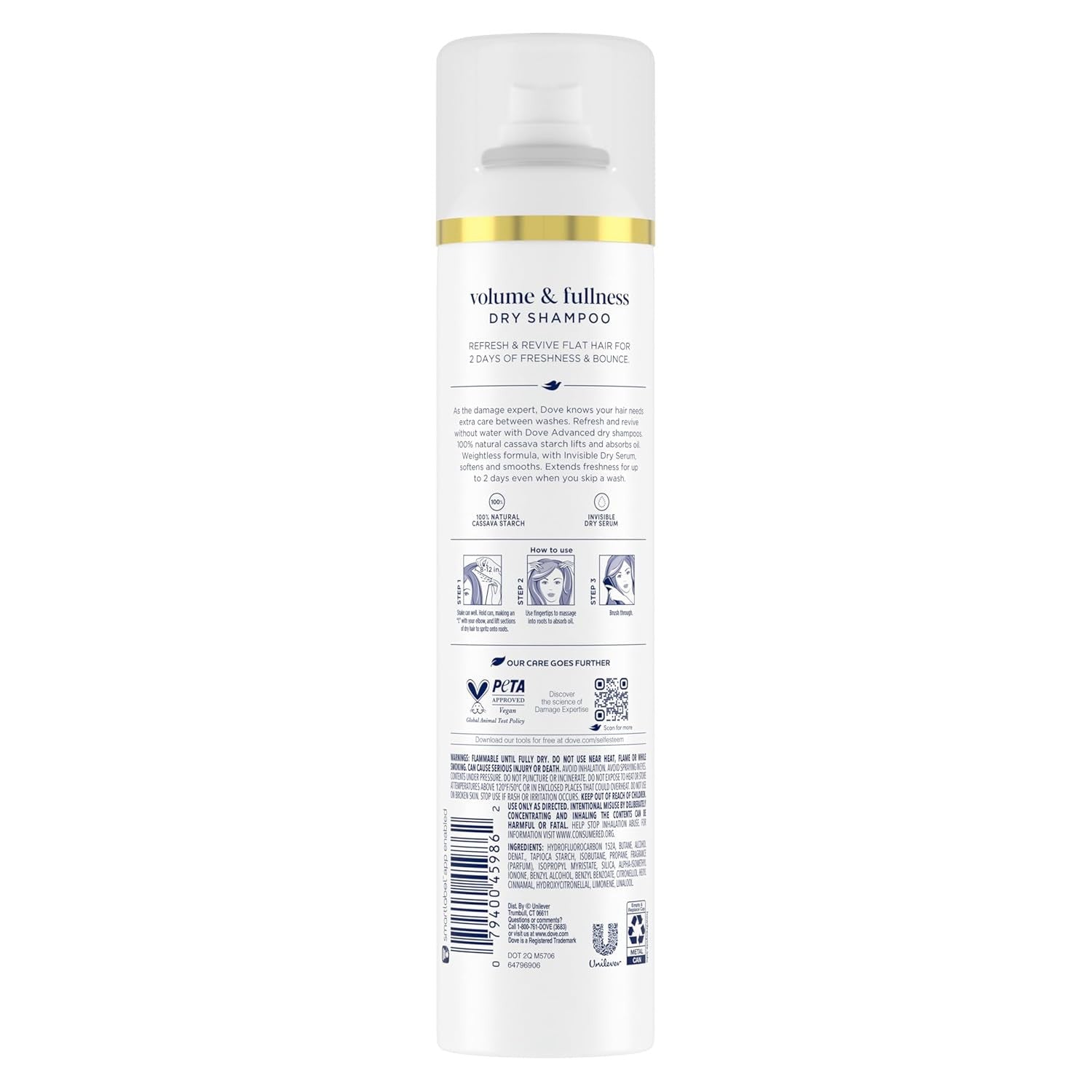 Need to get ready in a hurry? Pressed for time after a gym session? Whatever the reason, now you can extend freshness for up to 2 days even when you skip a wash. When you don’t have time for a full hair wash with water, Dove Volume & Fullness Advanced Dry Shampoo with 100% natural cassava starch lifts and absorbs oil and its weightless formula, with Invisible Dry Serum, softens and smooths. It refreshes & revives flat hair for 2 days of freshness & bounce, taking it from lifeless to voluminous in moments. No residue. No white cast. As the damage expert, Dove knows your hair needs extra care between washes. Give your hair the superior care it needs with Dove Advanced Dry Shampoo, formulated with Bio-Protein Care to refresh hair while softening and smoothing. Dove Advanced Dry Shampoos were created for all hair textures and types and can be used on color treated hair so you can keep your hair refreshed anytime, anywhere. Shake Advanced Dry Shampoo well. Hold the can 8-10 inches away and lift sections of dry hair to spritz onto roots. Use fingertips to massage the volumizing spray dry shampoo into roots to absorb oil. Brush out straight hair and comb through with fingertips for curly and wavy hair. At Dove, our vision is of a world where beauty is a source of confidence, and not anxiety. So, we are on a mission to help the next generation of women develop a positive relationship with the way they look - reaching over a billion young people with self-esteem education by 2030. As always, Dove hair products are vegan and PETA approved, meaning they’re not tested on animals globally.