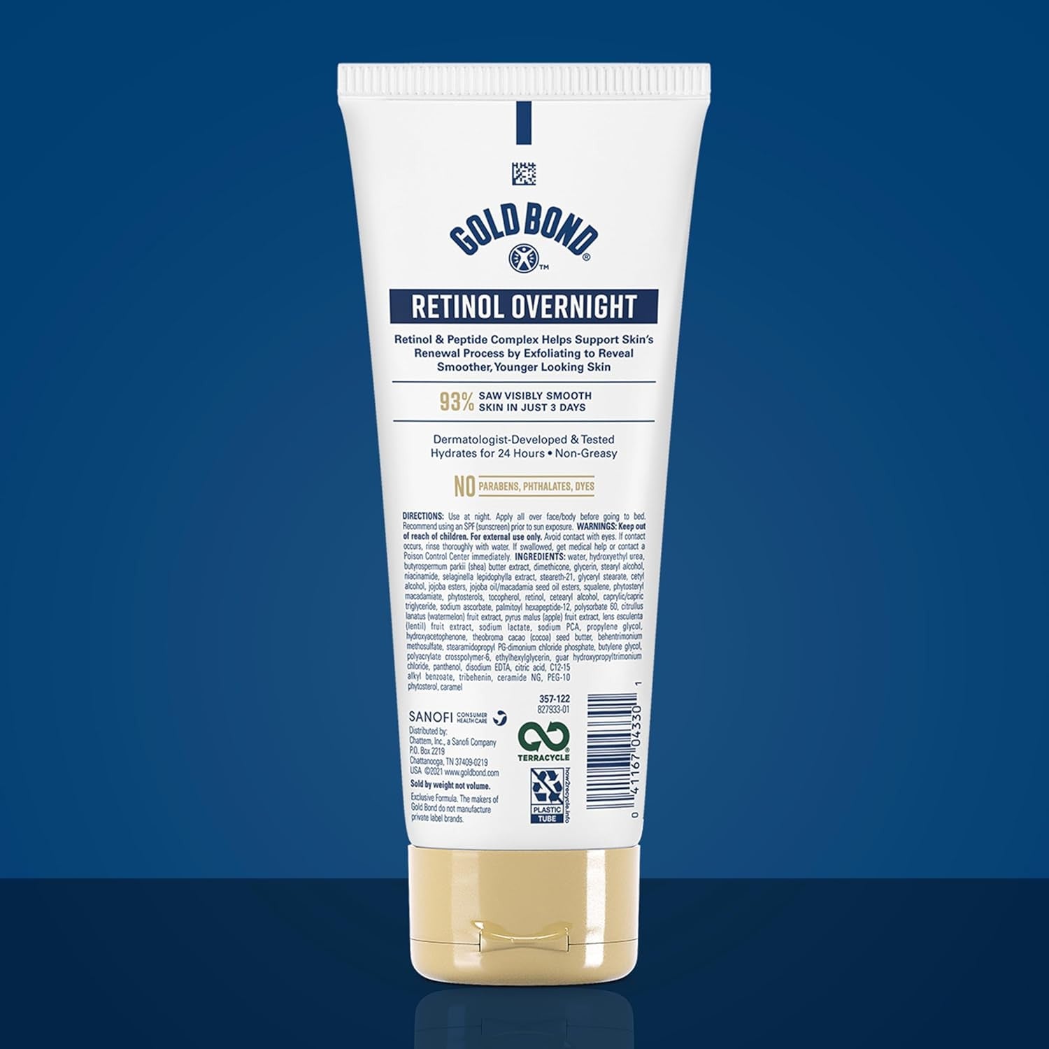 Smoother-looking skin is a sleep away with Gold Bond Age Renew Retinol Overnight Body & Face Lotion. Formulated with retinol, the most clinically tested anti-aging ingredient*, this dry skin lotion for mature skin helps visibly improve bounce and elasticity to skin. How it works: Retinol supports skin's collagen to visibly tighten and lift skin for a more youthful appearance. This Gold Bond Age Renew body moisturizer also provides long-lasting hydration with nourishing shea and cocoa butter. The non-drying, non-irritating retinol formula even locks in moisture while you sleep. Best of all, this dermatologist-developed and tested fragrance-free lotion is hypoallergenic and free from parabens, dyes, and fragrances. It's suitable for all over the body and face everyday use, when used as directed. Experience visible improvement in fine lines and wrinkles** with Gold Bond Age Renew Retinol Overnight lotion. Your skin is a champion. One that never settles for silver. Gold Bond is high-performance skin care for real life so you can be your best while keeping your skin at its best. *Based on number of clinical tests for anti-aging efficacy
