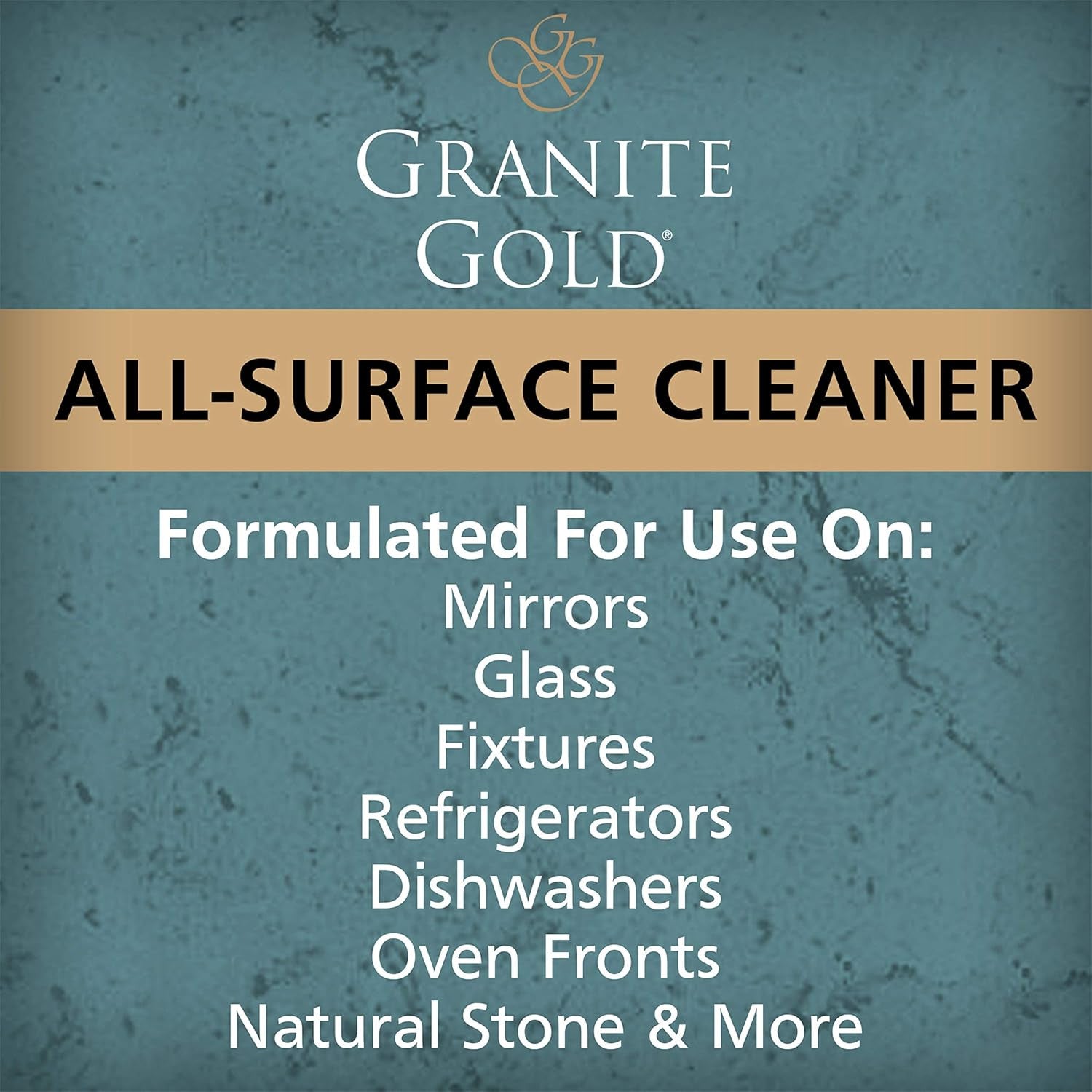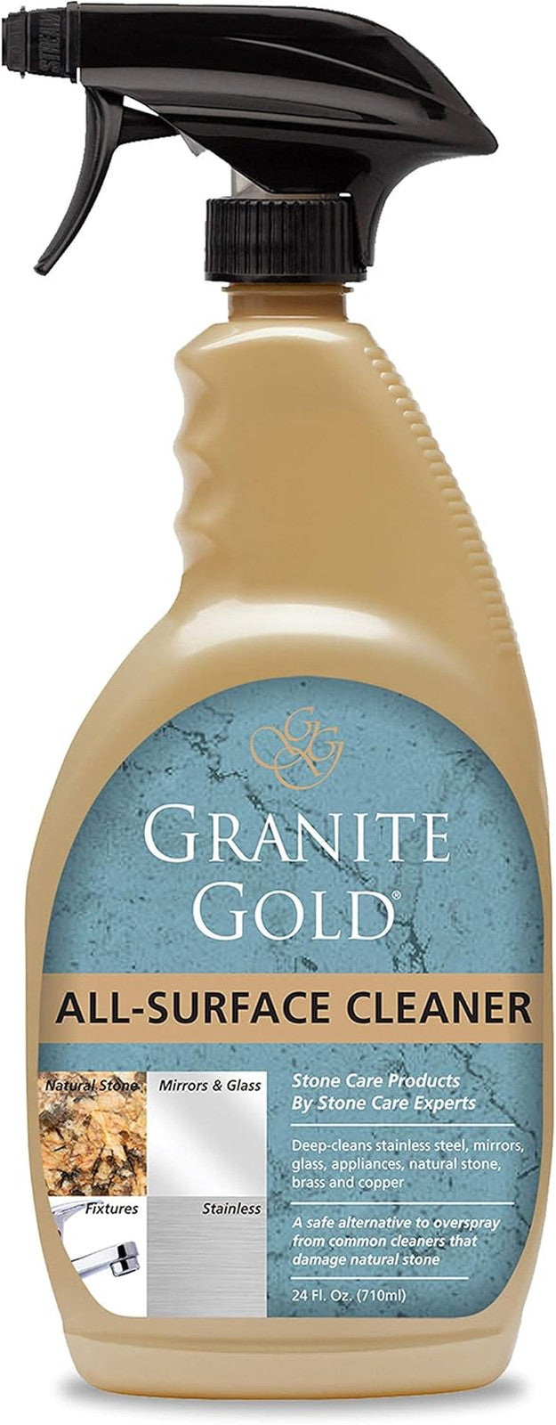 Granite Gold All-Surface Cleaning Spray will clean countertops, fixtures and appliances all over your home. It is safe to use on all stone surfaces including granite, marble, limestone, travertine, onyx, slate, as well as stainless steel, glass, quartz and more! The household cleaning spray will leave behind a gorgeous, streak-free result every time. You’ll love how clean and clear your mirrors are after using this cleaner. Say goodbye to streaks, fingerprints and smudges on your stainless steel appliances too.The cleaning spray contains no phosphates or ammonia. It is pH balanced and safe to use on surfaces where food is prepped. This spray is proudly made in the USA.About Granite GoldKnown widely as the Stone Care Experts, Granite Gold’s passion is natural stone. Granite Gold is a family owned company with more than 50 years of experience in stone care that spans over three generations. The Granite Gold collection of products is unsurpassed in expertise, passion and quality, protecting your natural stone like no other product.