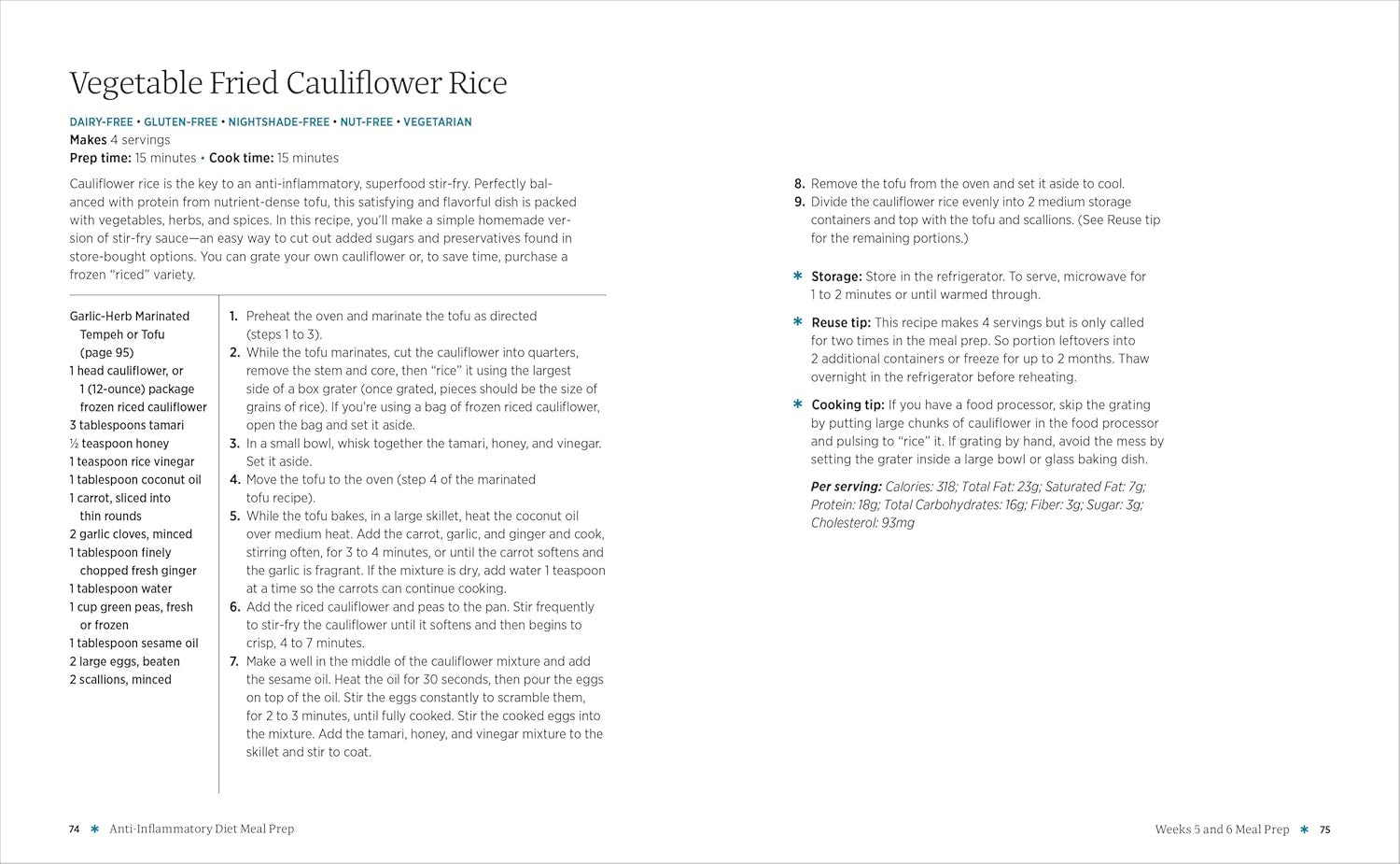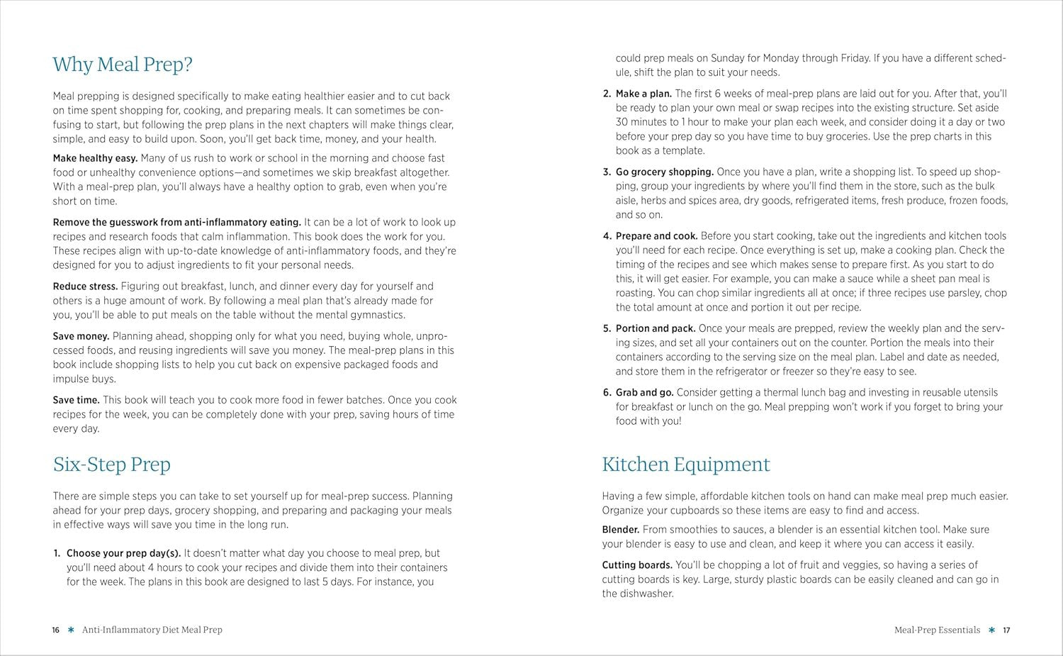 Stock your fridge with meals that taste great and reduce inflammation  Inflammation is at the root of numerous health conditions. An anti-inflammatory diet can play a key role in reducing inflammation and restoring vitality to the body. Anti-Inflammatory Diet Meal Prep makes it easy to receive the benefits of an anti-inflammatory diet with 6 weeks of meal prep ideas and 84 delicious, whole-food recipes. This anti inflammatory cookbook offers step-by-step instructions on shopping, prepping, and cooking tasty, nutritious meals. Following the week-by-week meal plan, your fridge will be stocked with multiple healthy dishes, ready to be heated and enjoyed. Keep your taste buds happy with over 80 delightful recipes including sweet and crunchy ginger-berry granola, tangy lemony lentil salad, and hearty baked salmon cakes. It's easy to maintain a daily, anti-inflammatory diet when you have satisfying, whole-food meals at the ready! Discover simple meal prep techniques to keep your fridge stocked with this delicious anti-inflammatory cookbook.