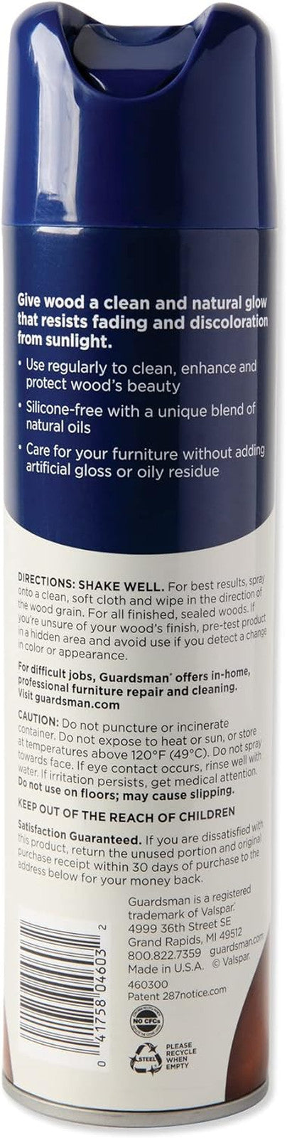 Guardsman Anytime Clean & Polish delivers a rich, clean, low-luster shine for a natural glow without oily, dust-attracting residue. Our premium formula contains UV absorbers, protecting wood against fading and discoloration from sun exposure. Used regularly to clean and polish wood, it protects and beautifies while helping to conceal the appearance of fine surface scratches. Unlike some polishes, Guardsman Clean & Polish contains no silicones and won't change the sheen of your wood. Since 1915, Guardsman has been the leader in caring for and protecting wood furniture. That stature is why Guardsman is trusted worldwide by furniture professionals. Today, Guardsman brings its industry-leading furniture protection to even more fine and delicate surfaces, including fabric, leather, appliances and outdoor furniture with premium ingredients and formulations.   Guardsman Lemon Fresh Revitalizing Wood Polish, 12.5oz. Guardsman Revitalizing Wood Polish delivers a rich, clean, low-luster shine for a natural glow without oily residue. Used regularly to polish wood, it protects and beautufies while helping to conceal the appearance of fine surface scratches. Unlike some polishes, Guardsman Revitalizing Wood Polish contains no waxes, abrasives, or silicones, and leaves no greasy film or buildup. Guardsman is excellence in furniture care since 1915.