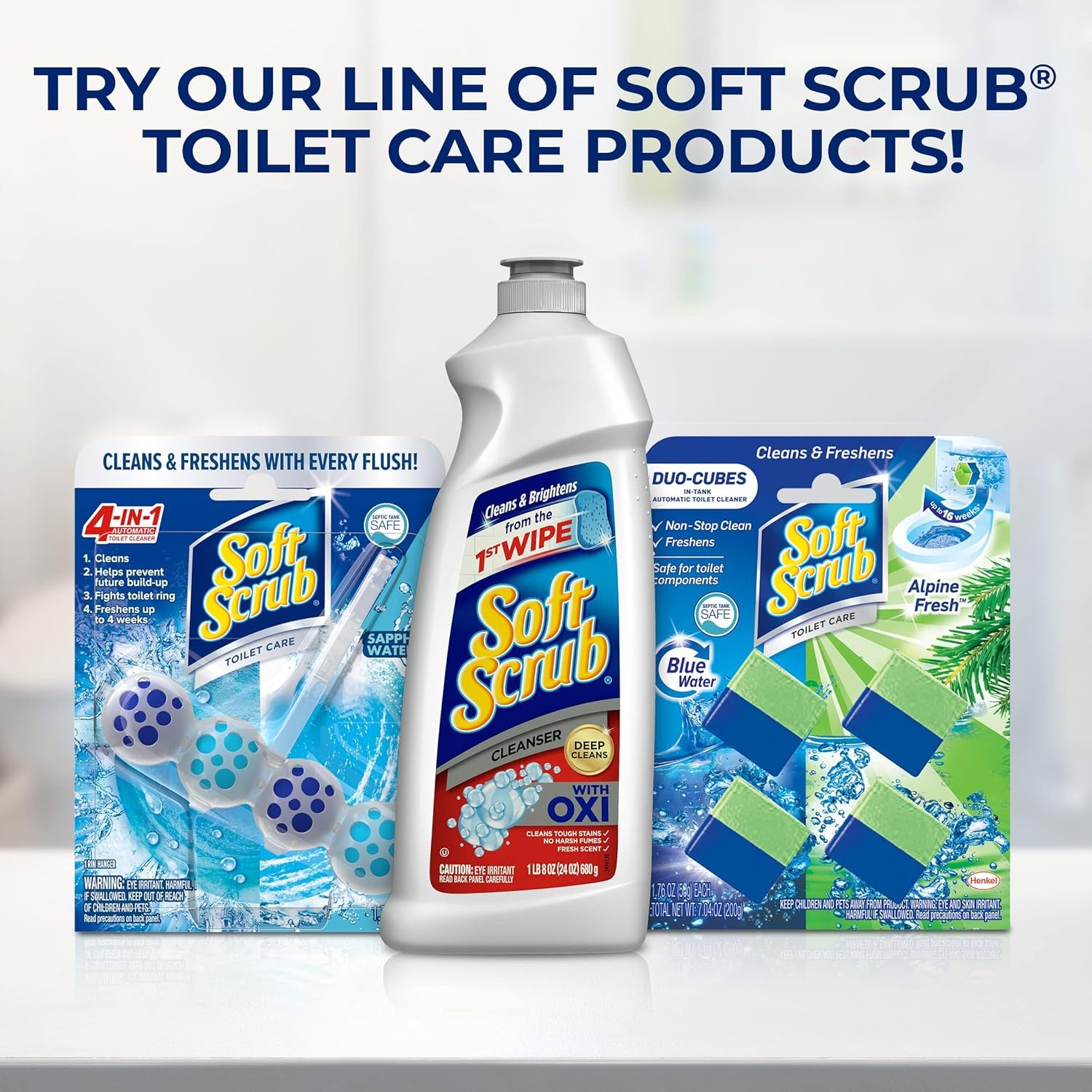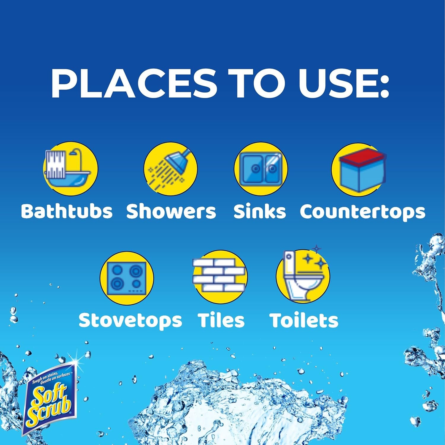 Soft Scrub Oxi Cleanser is infused with millions of Oxi scrubbers that activate while you clean. With instant cleaning action, Soft Scrub Oxi Cleanser gives you a deep clean by penetrating the stain, resulting in a shiny clean surface. Formulated for use on surfaces throughout the kitchen and bathroom, Soft Scrub Oxi Cleanser removes wine, coffee, juice, and tea stains as well as many other stains. Use Soft Scrub Oxi Cleanser to clean bathtubs, countertops, showers, sinks, stovetops, tiles, and toilets. This product is Orthodox Union certified Kosher. Directions: Shake well before use. Squeeze directly onto surfaces or onto damp cloth. Rub gently. Rinse or wipe clean. Caution: Eye Irritant. Contains calcium carbonate and detergent. First aid: Eyes—Flush with water for 15 minutes. If swallowed—Drink a glassful of water. Call physician. Keep out of reach of children.