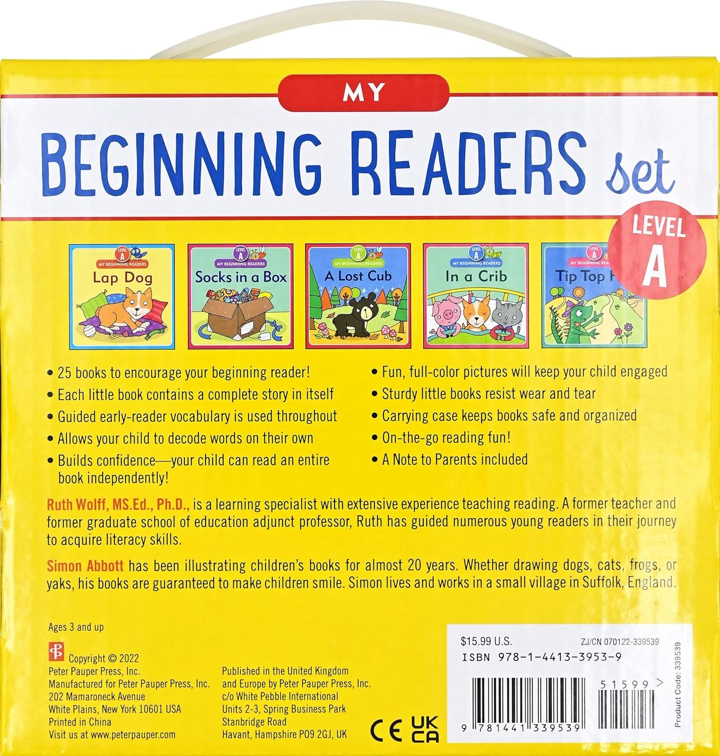 A boxed set of 25 books for your beginning reader! Publisher's Note: Here is the order of the 25 Books: Author Ruth Wolff, MS. Ed., Ph.D., is a learning specialist with extensive experience teaching reading to beginning learners. She holds a master's degree in special education and a doctorate in English and American Literature. Ruth has guided numerous young readers in their journeys to acquire literacy skills. Simon Abbott has been illustrating children's books for nearly 20 years. Whether drawing dogs, cats, frogs, or yaks, his books are guaranteed to make children smile. Simon lives and works in a small village in Suffolk, England.