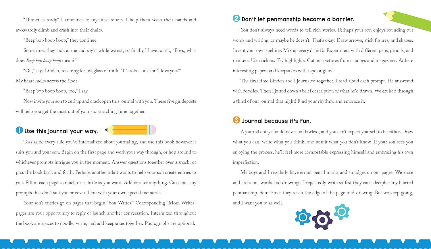 A must-have guided journal to nurture a deeper connection to your 5-to-8 year old son filled with adorable, interactive, and age-appropriate prompts and activities to record your memories! As your little boy grows up and learns to read and write, the two of you can catch special memories in this journal as you swap stories, compare ideas, and explore things you love with each other! Letters, drawings back and forth, and interactive lists invite mother and son to reflect, write, and doodle about all of the things in their life together. Watch your son build self-confidence and improve his penmanship! With this unique journal for young kids just learning to read and write, mother and son will illustrate or write: Whether you're looking for the perfect creative gift or book for mom or son, intentional activity kits for kids, a meaningful and fun homeschooling tool, or a unique memory book for mom and son, this shared guided journal is sure to be a hit. Let's celebrate your story!
