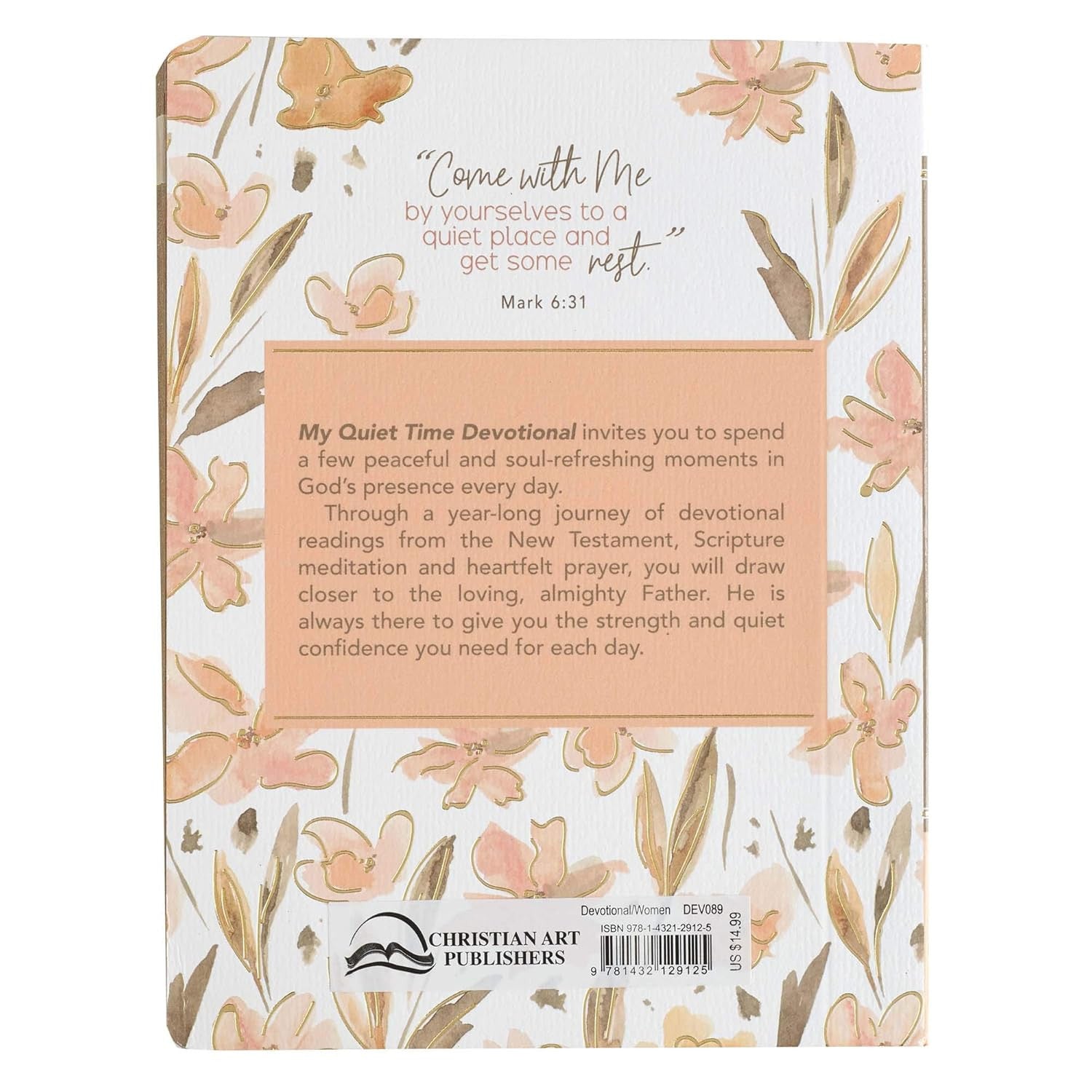 My Quiet Time Devotional 365 devotions to bring you into the peace of the presence of GodEach weekday's reading starts with a title that explains the central theme for the day, followed by a supporting Scripture verse and devotional passage. The day's reading ends with a thought-provoking question to ponder. The entries for the weekend include a prayer written by a Christian author and the opportunity to pen your own intimate prayer.The inside pages are printed in full color and feature decorative floral elements in the same peachy palette as the cover. The page edges are gold foiled to beautifully complement the gold foil accents on the daily devotional's cover.The gift-ready devotional has a presentation page in the front and makes an excellent birthday gift or gift to encourage a friend. Consider gifting the My Quiet TIme Devotional to a teacher, Bible study leader, neighbor, or anyone committing to daily quiet time with the Lord.
