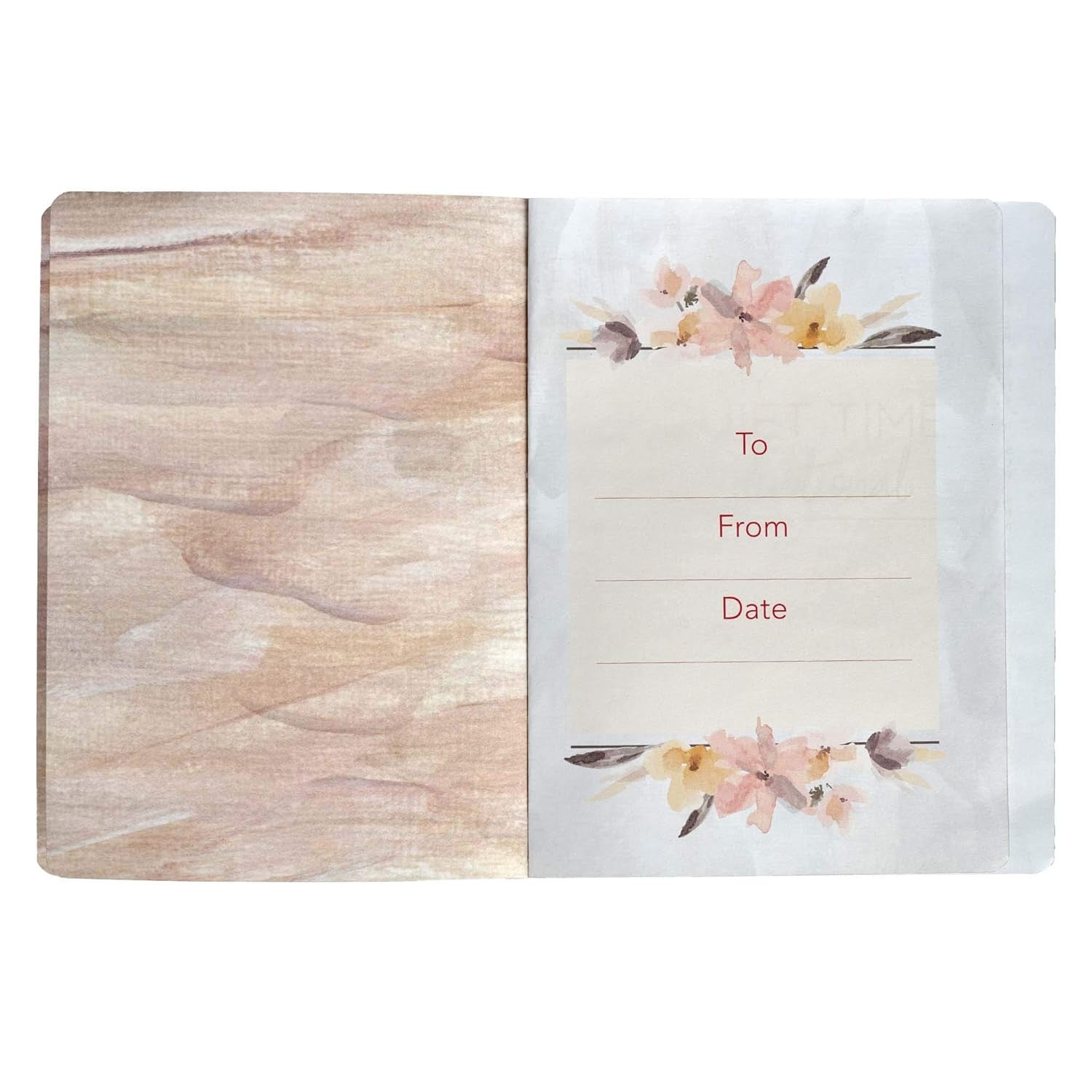 The heavy-duty cardstock flexible cover of the My Quiet Time Devotional is decorated in peach-colored petals trimmed in gold foil. The title is placed in a white frame and bordered by gold foil at the top and the bottom.