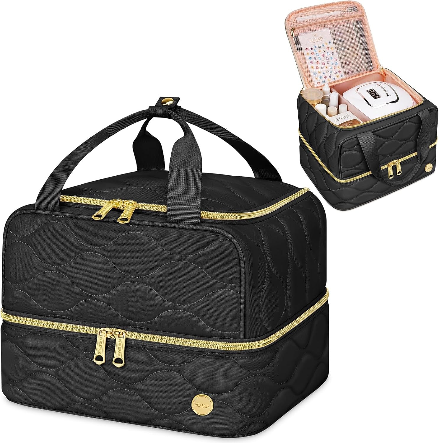 Keep your nail polish, gel bottles, and manicure or pedicure tools perfectly organized—whether you're at home, in the salon, or on the go—with this all-in-one nail polish organizer case. Designed for professional nail tech organizers and storage, hobbyists, and beauty students alike, this double-layer nail bag organizer case offers functional design, durable protection, and versatile storage in one compact package. The bottom layer features a foam insert with 42 individual slots to keep your polish upright and safe. Compatible with most 15ml (0.5 fl.oz) bottles, it's ideal for storing gel polish, dip powders, and nail art top coats. The upper section features an adjustable divider that flexibly stores your UV nail lamp, electric nail drill, buffers, or clippers. A zippered mesh pocket on the flap keeps stickers, glitters, and small nail accessories tidy. This thoughtful layout transforms your nail gear into an efficient, customizable nail storage organizer. It features a reinforced top handle for grab-and-go portability. Lightweight yet structured, this nail kit organizer fits neatly into a suitcase, carry-on, or salon drawer—perfect for travel or at-home use. Crafted with quilted nylon, soft sponge padding, and a suede-lined upper interior, it’s more than just a nail polish organizer bag—it’s protection you can trust. The sturdy bottom panel keeps everything upright, preventing sagging or spills. It also doubles as a reliable nail supply storage solution at home or in the salon. Looking for a gift? This case makes an excellent choice for manicurists, daughters, girlfriends, or nail art lovers. It's a beautiful and practical nail organizer bag that also works great as an art supply storage organizer for small bottles, glitters, or hobby tools. Whether you call it a nail polish case, nail supply bag, or nail polish storage organizer, it’s the perfect blend of style and function.