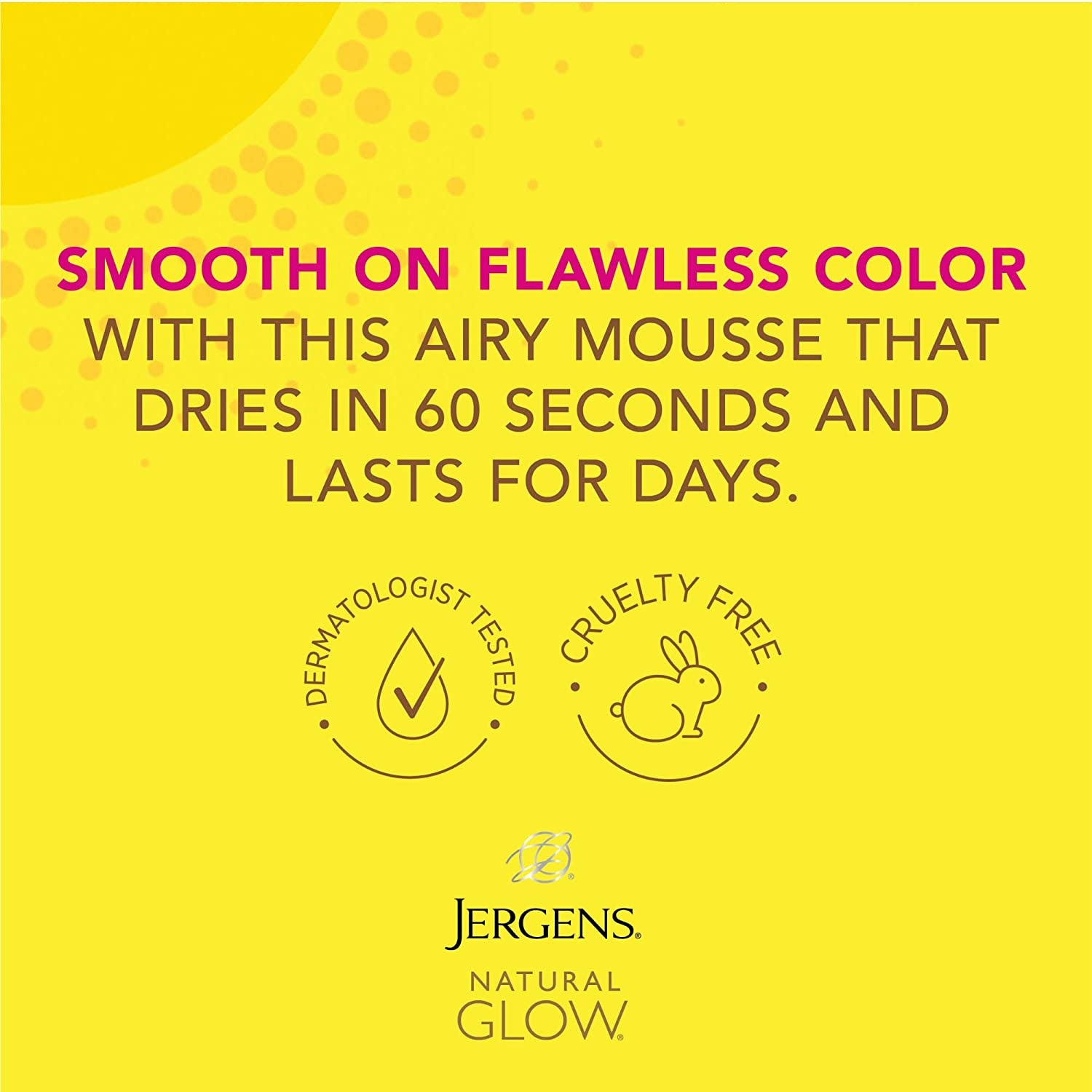 Get a beautiful, quick, natural looking tan in just 60 seconds by smoothing on streak free Jergens Natural Glow Instant Sun Sunless Tanning Mousse for Body. This lightweight, odor free light bronze color mousse works with your skin tone to mimic results you’d get from the natural sun, and without the unpleasant sunless tanner odor. The tinted formula lets you see where you’ve applied it, so the result is a precise, even glow that dries in 60 seconds. The instant natural bronze color will continue to develop for several hours after application to a natural looking shade. If you’d like deeper fake tan color, the sunless tanner formula is buildable, and can be applied again the next day. It’s safe, hassle-free color even when the beach is miles (or months) away. This natural bronzer by Kao USA will leave gorgeous skin looking sun kissed, no matter what time of the year it is. Sunless tanning has never been easier. Satisfaction Guaranteed. Limitations may apply.