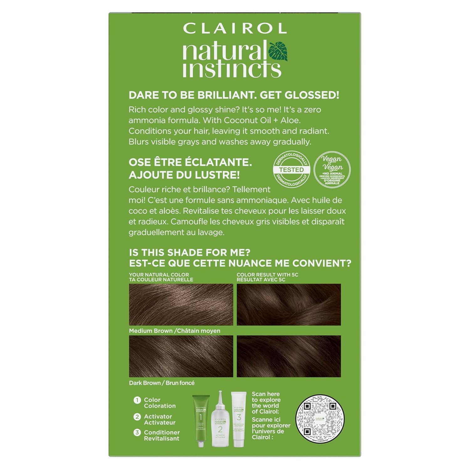 Clairol Natural Instincts enhances your look with rich, radiant color and glossy, gotta-have-it shine! It’s a zero ammonia formula with Coconut Oil + Aloe, that conditions your hair leaving it smooth and radiant. This vegan* formula gives you no commitment gentle color that blurs visible grays and washes away gradually . Available in 37 natural-looking shades, so you can find the black, brunette, blonde, or red hue that's totally you. Discover your natural way to shine with Clairol Natural Instincts! *Learn more about Vegan on our website.