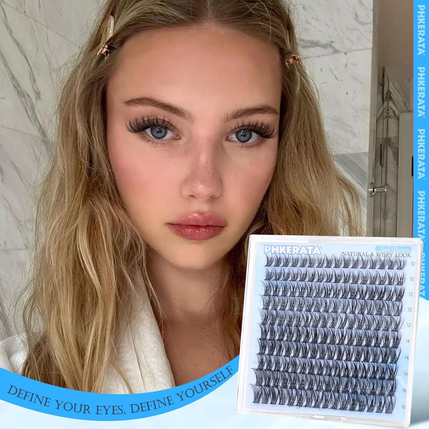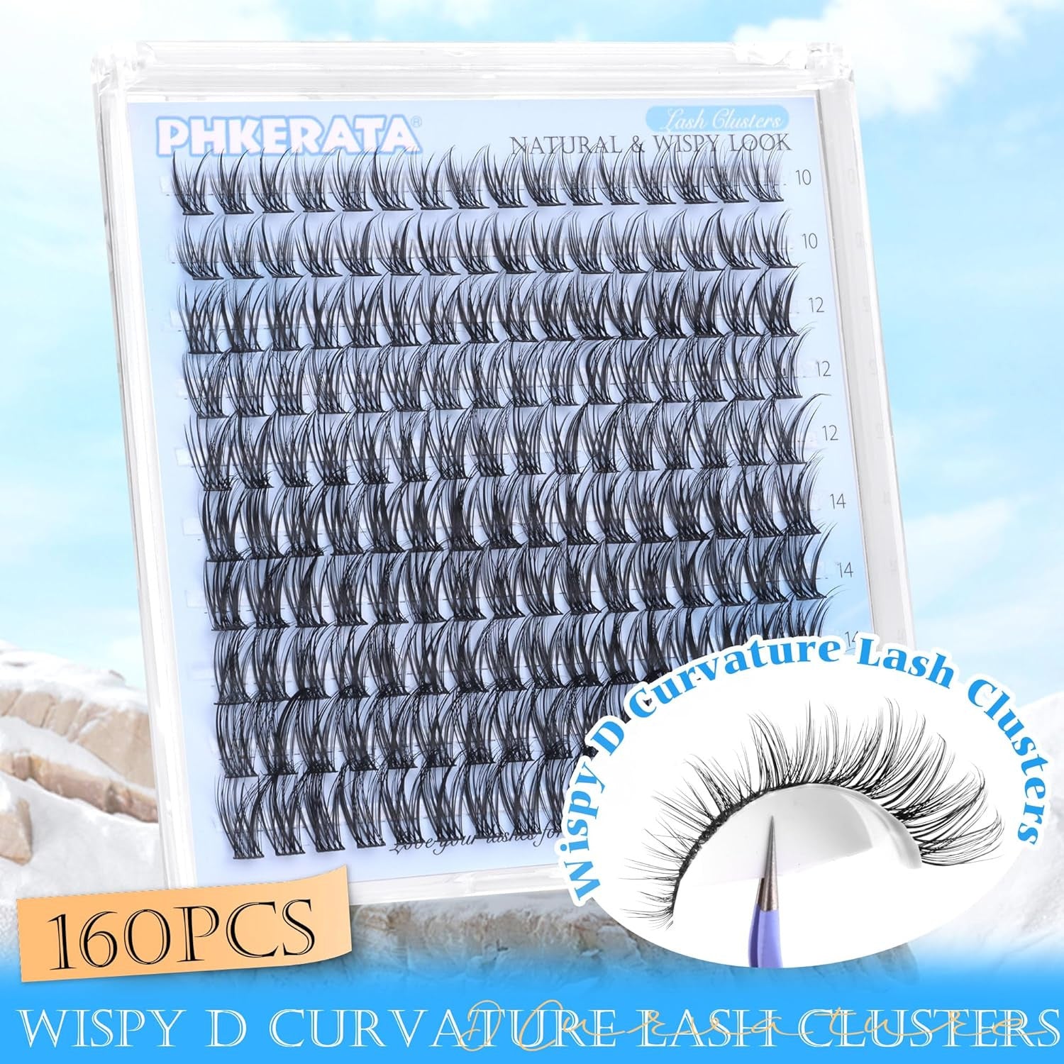 PHKERATA Natural Lash Clusters Wispy Eyelash Clusters 160 pcs Individual Lashes D Curvature Wispy 10-16 mm Cluster Eyelash Extensions DIY Eyelash Extension with Thin Lash Band