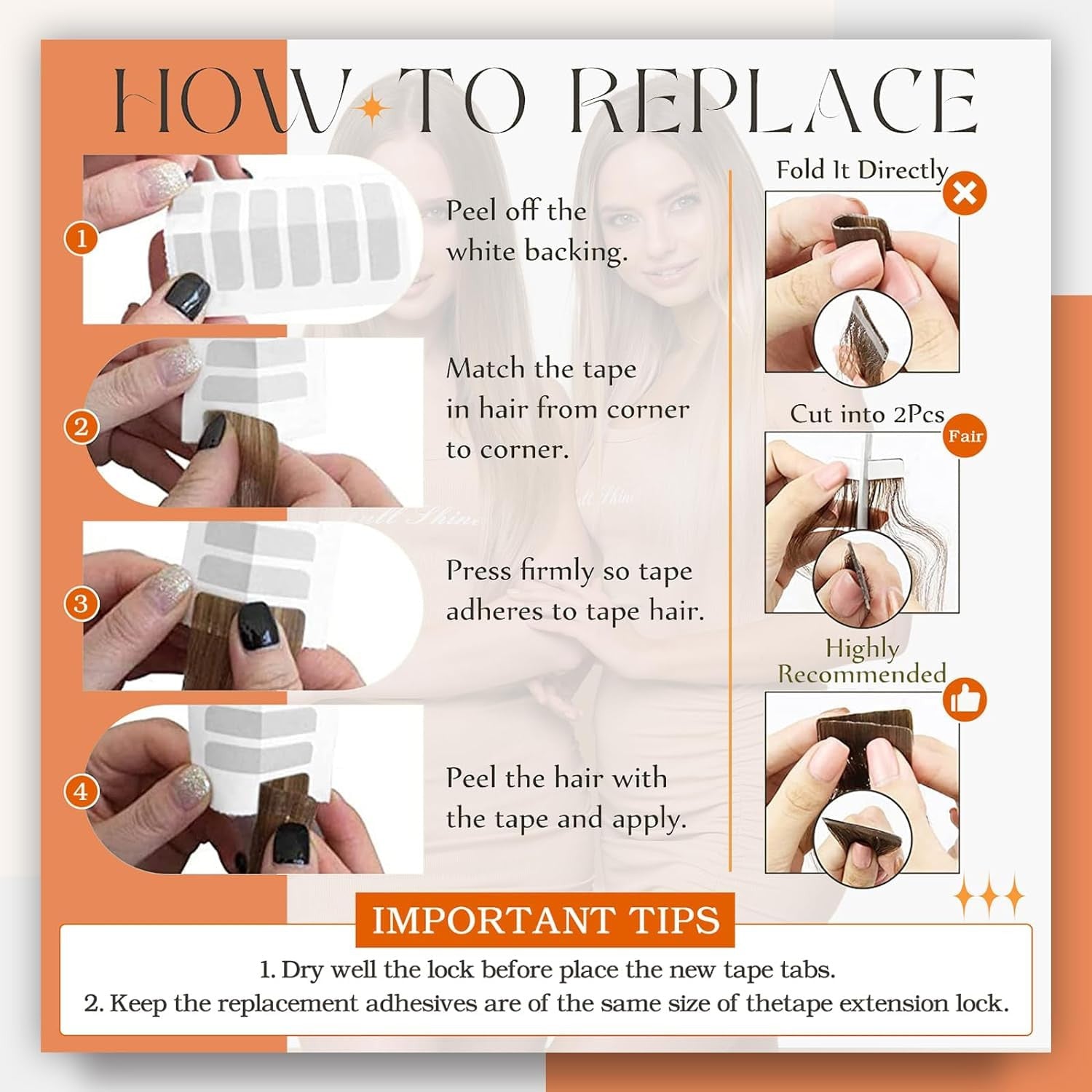Elevate your style with our Tape in Hair Extensions Real Human Hair. Made from real remy human hair, these extensions blend seamlessly into your natural hair. From adding length and volume to creating highlights.Our strong tape ensures a secure fit.Choose the pack for your hair type and thickness. They are ideal for everyday use as they seamlessly blend with your natural hair, providing a natural look and feel. If you are attending a special event like a wedding or prom, tape in extensions can help you achieve that glamorous hairstyle you've always dreamed of. Color Discrepancy Color variance or mismatch, often referred to as 'color discrepancy', can be a common issue in tape in hair extensions. This could be due to several factors, such as lighting conditions during production, differences in screen displays when purchasing online, or simply the natural variations that occur in human hair.To combat this issue, some prefer to order a swatch or a small sample of the hair extension before making a full purchase. And We Can Help You to Choose The Right Color. Don't Worry. The application process is fairly straightforward. Your hairstylist will section off your hair, press the adhesive side of the extension onto the underside of a section, then place another extension on top. The process sandwiches your natural hair between two extensions, which helps them blend seamlessly.One of the key benefits of tape hair is their lightweight and flexible nature. They lay flat against the scalp, providing a comfortable fit, and blend well with your natural hair. Don't use conditioner or olive oil before installation.Sandwich is the best way but don't sandwich too much hair.Don't wash your hair in 48 hours.Tape extension must be applied to washed clean hair. Part your hair in desired area.Rip off the cover on the tape extension. Line up extension directly and attach by pressing to piece of desired hair.Double the thickness by adding another layer to the underneath of the piece.Two sticky sides face each other and the section of hair will be in the middle Our hair can be styled like your own hair.When use hot iron, please keep the temperature less than 200 degrees Celsius. Hair can be dyed to the darker color.We recommend having your hair dresser dye the extensions, because coloring them by yourself always poses a high risk of not coming out the shade you want. when you want to dye the hair extensions, please wash the hair to ensure the hair is clean, because our hair will be deeply treated, if you dye it directly, it may not be easy to color 1.The tape need to be replaced regularly,we suggest that you replace the tape every 4-6 weeks.Peel off the white backing 2.Match the tape in hair from corner to corner 3.Press firmly so tape adheres to tape hair 4.Peel the hair with the tape and apply.Dry well the lock before place the new tape tabs,keep the replacement adhesives are of the same size of the tape extensions lock.After wearing tape in hair,heating the tapes 5-6s one time, repeating 5-6 times. Your hair is now thick and seamless. Make sure that the hair is straight when you measure it.Don't include the tape in your measurement. It is important to remember that proper care and maintenance are necessary to prolong their lifespan Tape in hair extensions are incredibly versatile and can be utilized for various occasions. Whether you're looking to add length, volume or color, tape hair can be a good solution. Tape in hair extensions are also ideal for trips as they require minimal maintenance. How do you keep the hair from getting tangled? We do not suggest sleep with your hair extensions wet. Instead of sleeping on a cotton pillowcase, we recommend using silk,which will reduce the amount of friction that is caused during your sleep. Can you dye the hair? Of course, Professionally installed hair extensions offer that kind of versatility, which enables both men and women to have the style, cut, or color of their dreams. How many packs do you need? If Your Hair is Fine, Need 1-2 Packs,If Your Hair is Thin, Need 3-4 Packs.Usually 3-4 Packs Can Get A Good Thickness. How many times can you reuse them? The tape in hair extensions human hair which can last 6–14 weeks according to different using way, you may also could use over 3 months. How to avoid tapes of tape hair extensions not sticking? Avoid applying oily hair care products near the tapes. Do not wash your hair for at least 48 hours after applying the extensions. When styling, avoid using high temperatures near the adhesive tapes.Be gentle when brushing or styling your hair.
