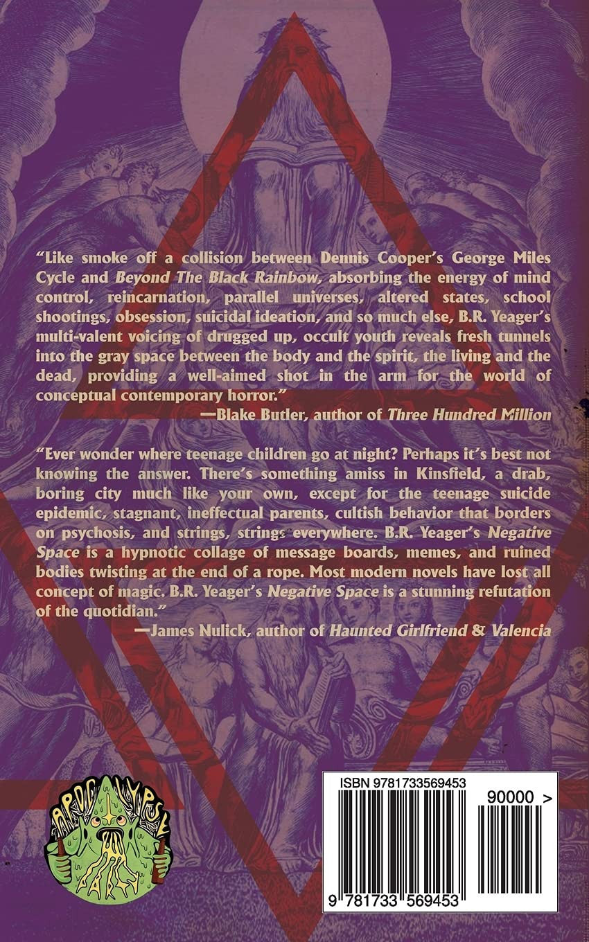 -Blake Butler, author of Three Hundred Million "Ever wonder where teenage children go at night? Perhaps it's best not knowing the answer. There's something amiss in Kinsfield, a drab, boring city much like your own, except for the teenage suicide epidemic, stagnant, ineffectual parents, cultish behavior that borders on psychosis, and strings, strings everywhere. B.R. Yeager's Negative Space is a hypnotic collage of message boards, memes, and ruined bodies twisting at the end of a rope. Most modern novels have lost all concept of magic. B.R. Yeager's Negative Space is a stunning refutation of the quotidian."