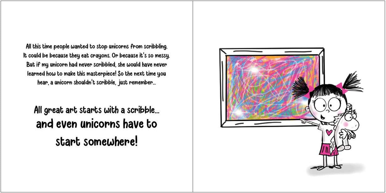 This story is about a little girl who keeps hearing, "Never let a unicorn scribble!" But in her heart believes that people just don't understand how beautiful scribbling can be. She keeps trying to teach her unicorn to scribble but soon realizes this is more difficult then she anticipated. But instead of giving up, she uses her imagination to come up with a creative way to get her unicorn to scribble, at first it looks like it was complete disaster but ends up being truly magical!